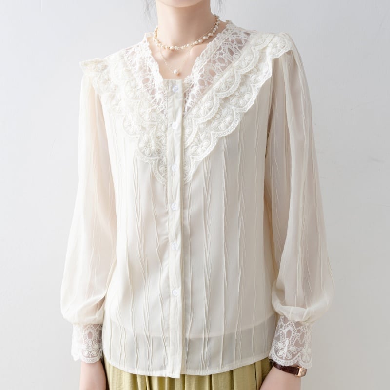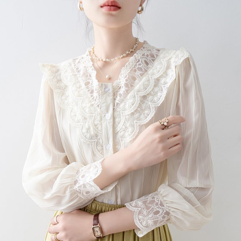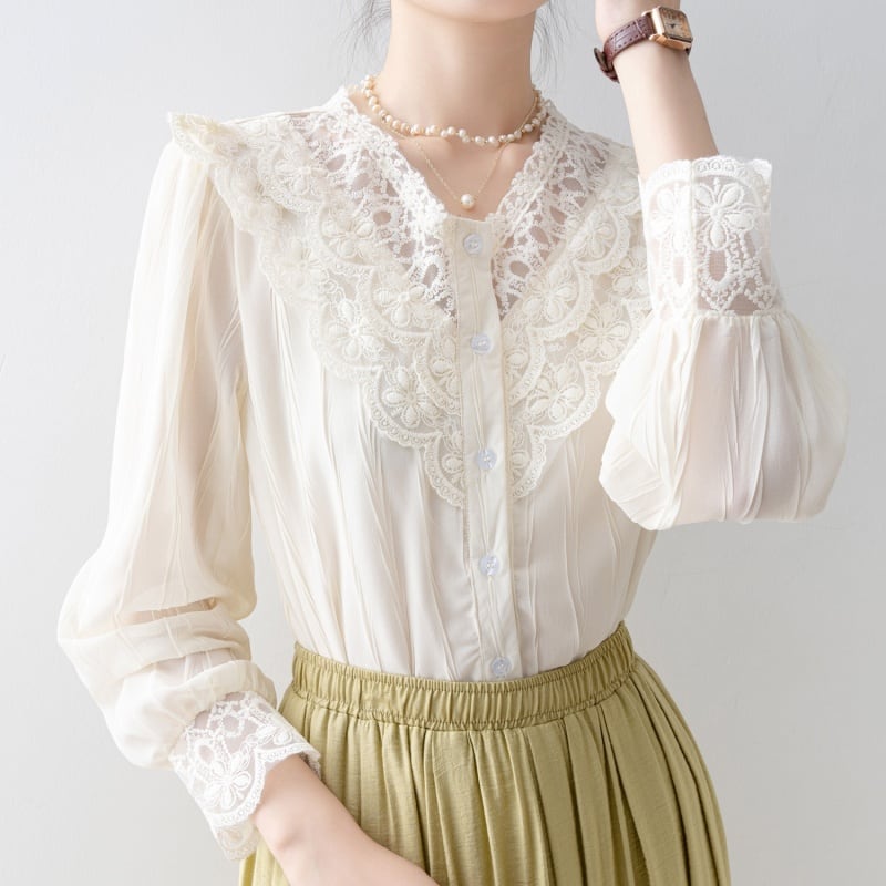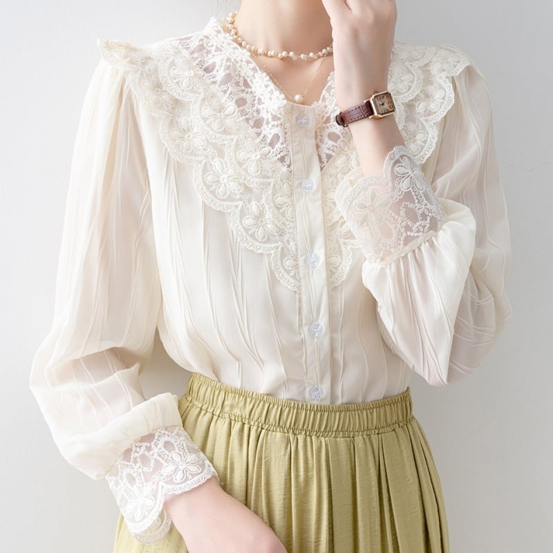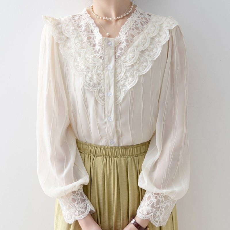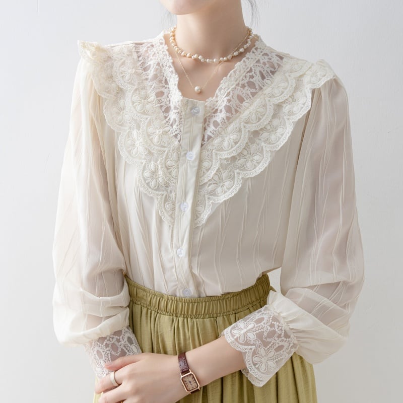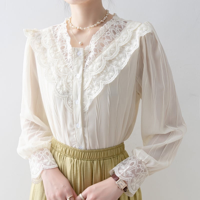 繊細なレース襟と袖口が、女性らしい上品さを演出するブラウスです。