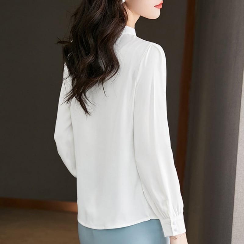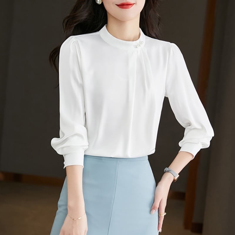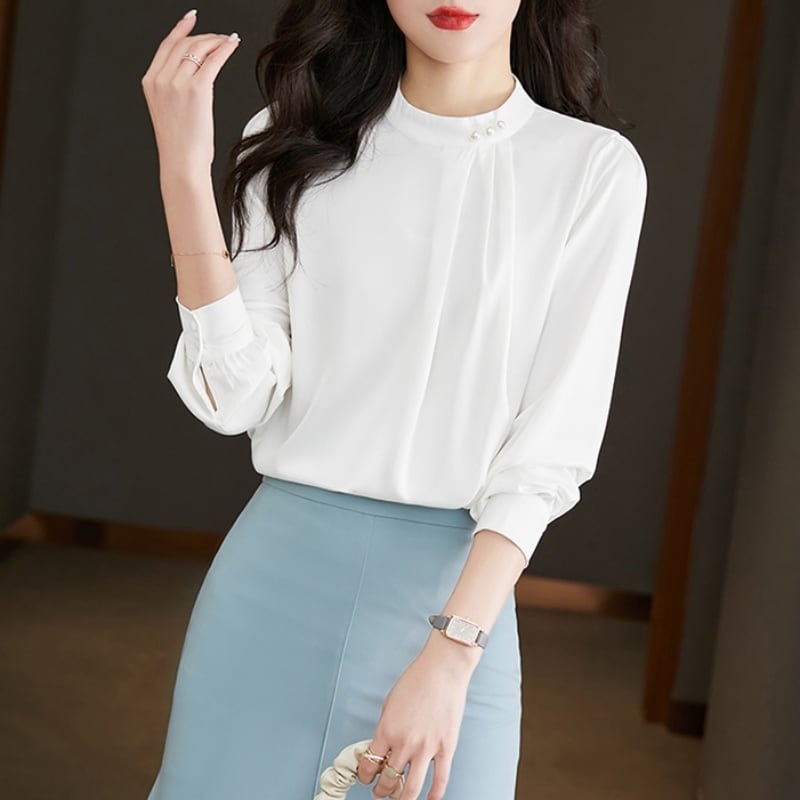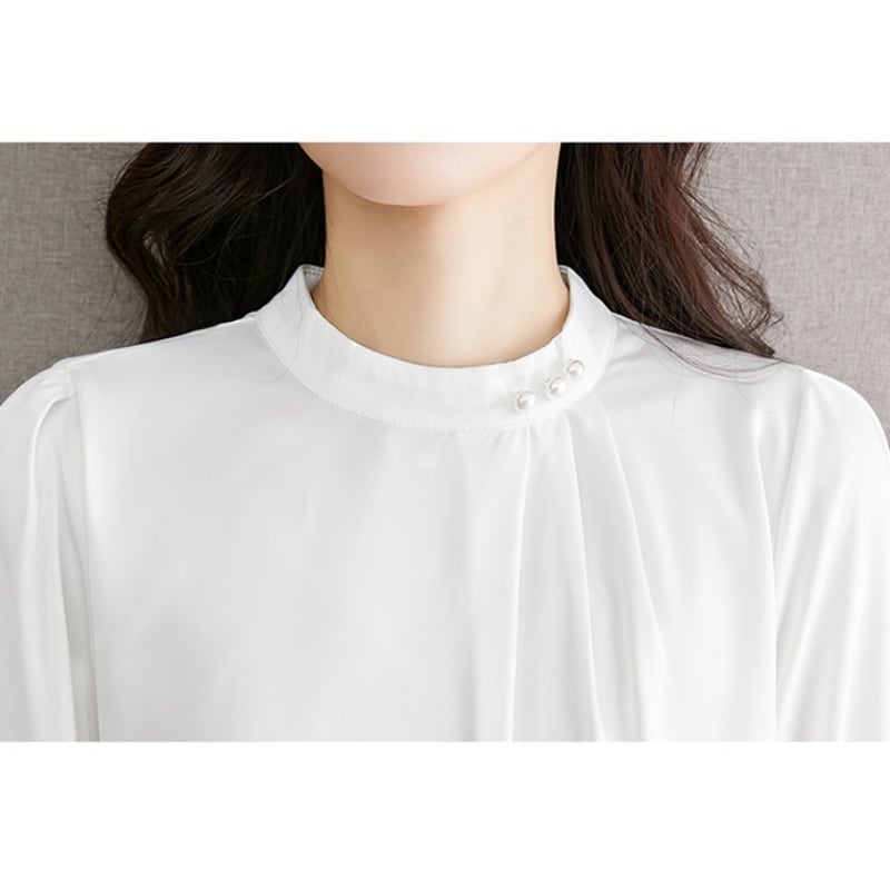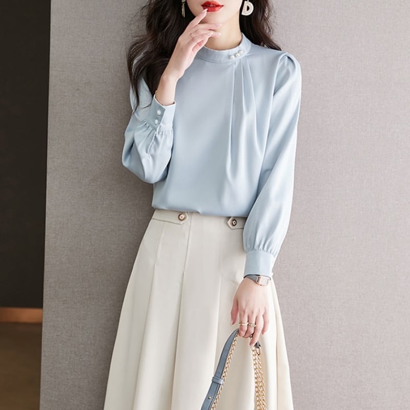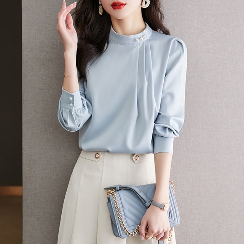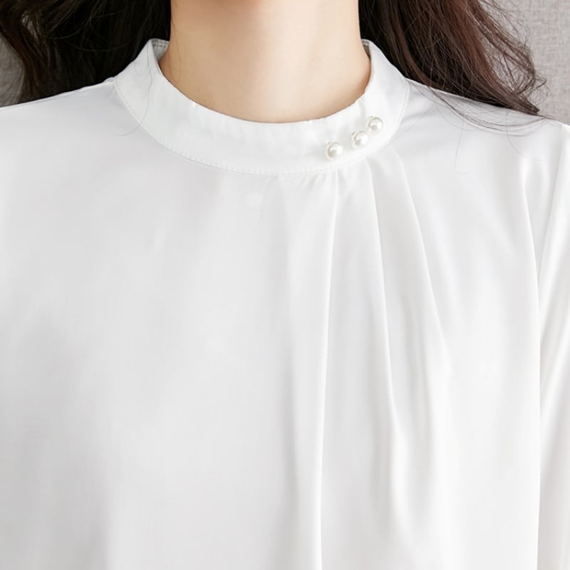 さりげなく輝くパールが、洗練された印象を与えてくれるブラウスです。