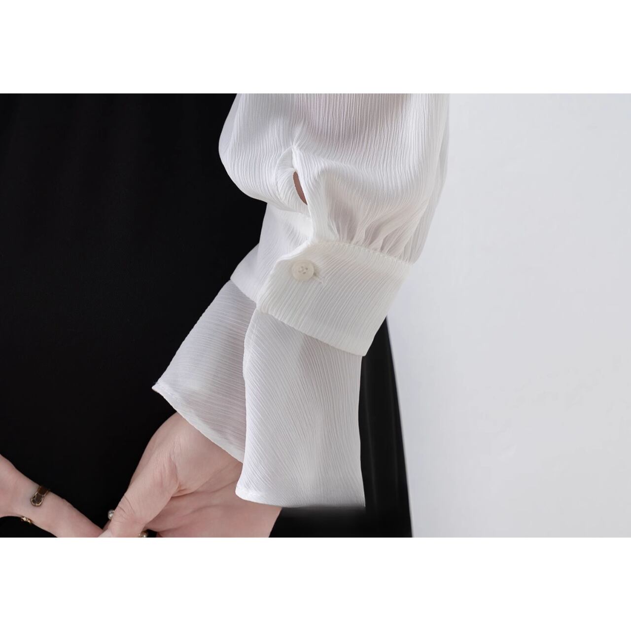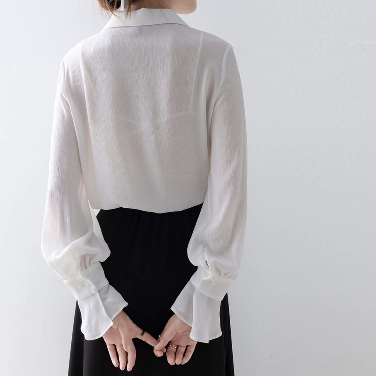 Vネックとたっぷりのフレアスリーブが女性らしいブラウスです。