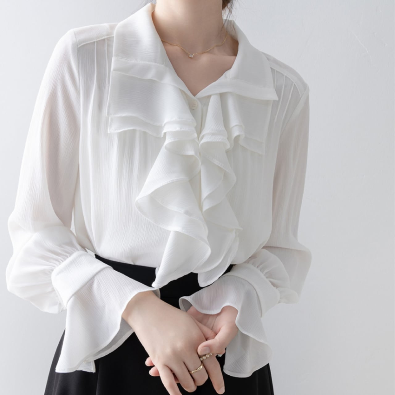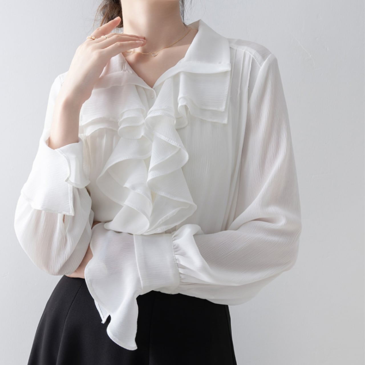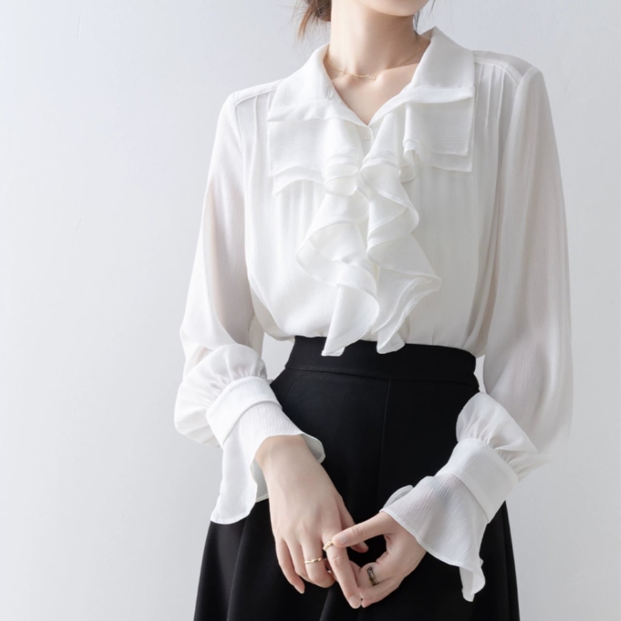 重ねられたフリルが華やかさを演出し、洗練された印象を与えます。