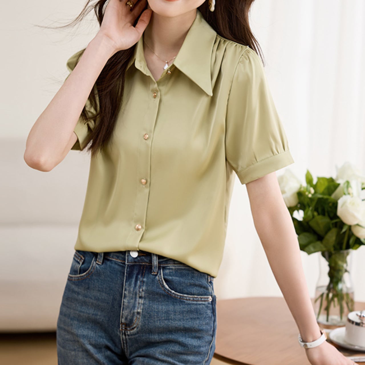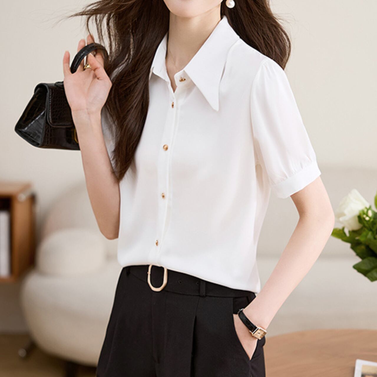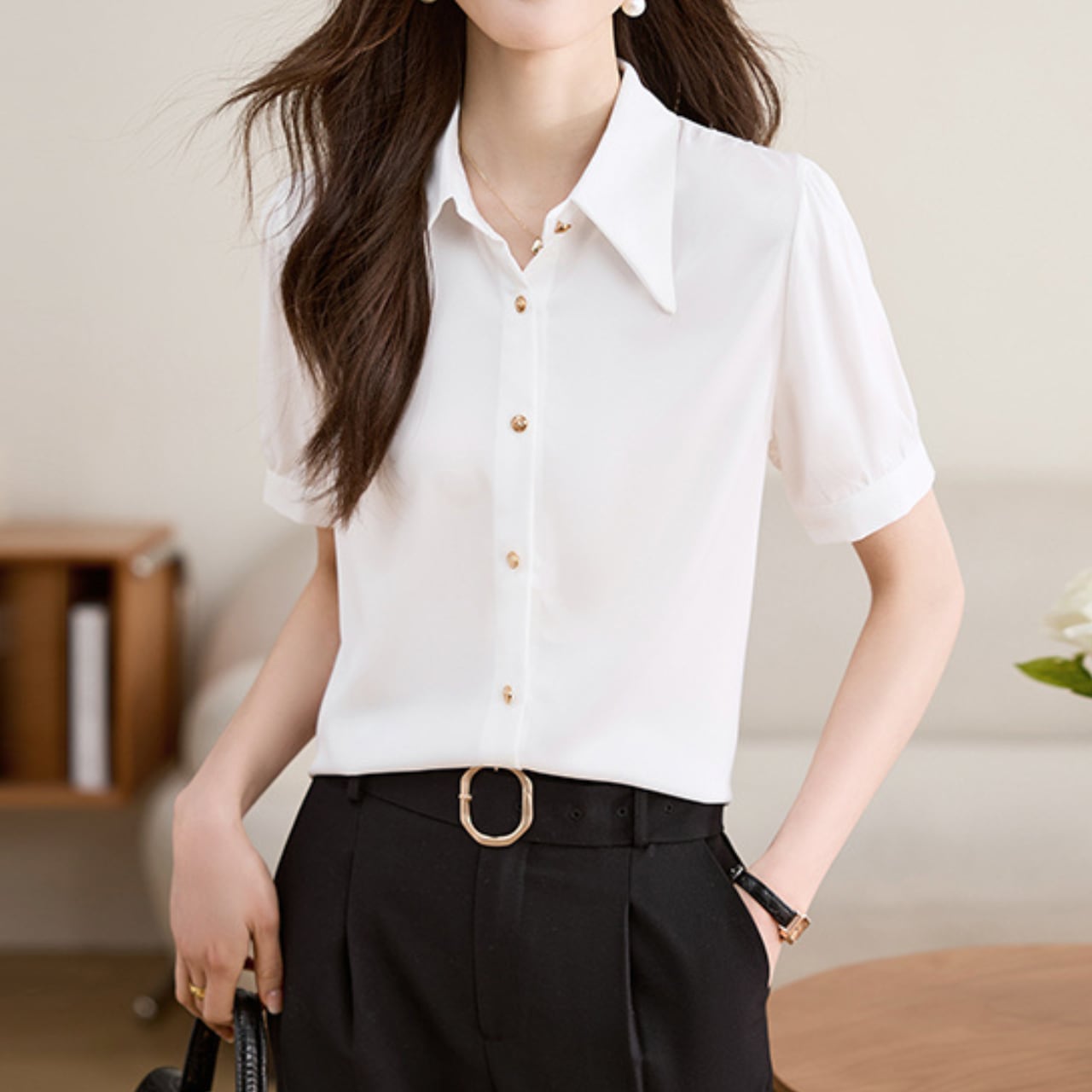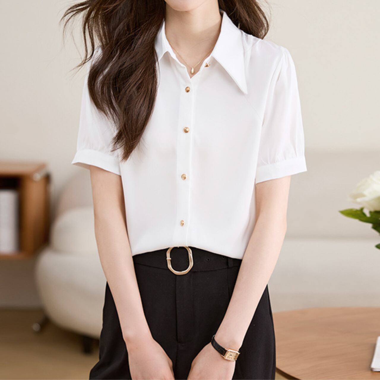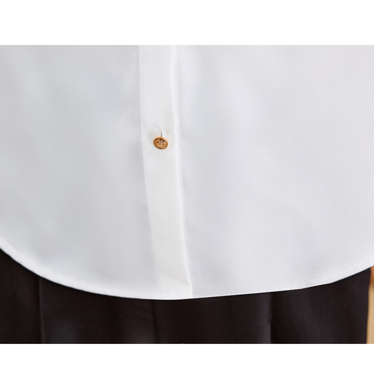上品なゴールドボタンを添えた、大人フェミニンなブラウスです。
