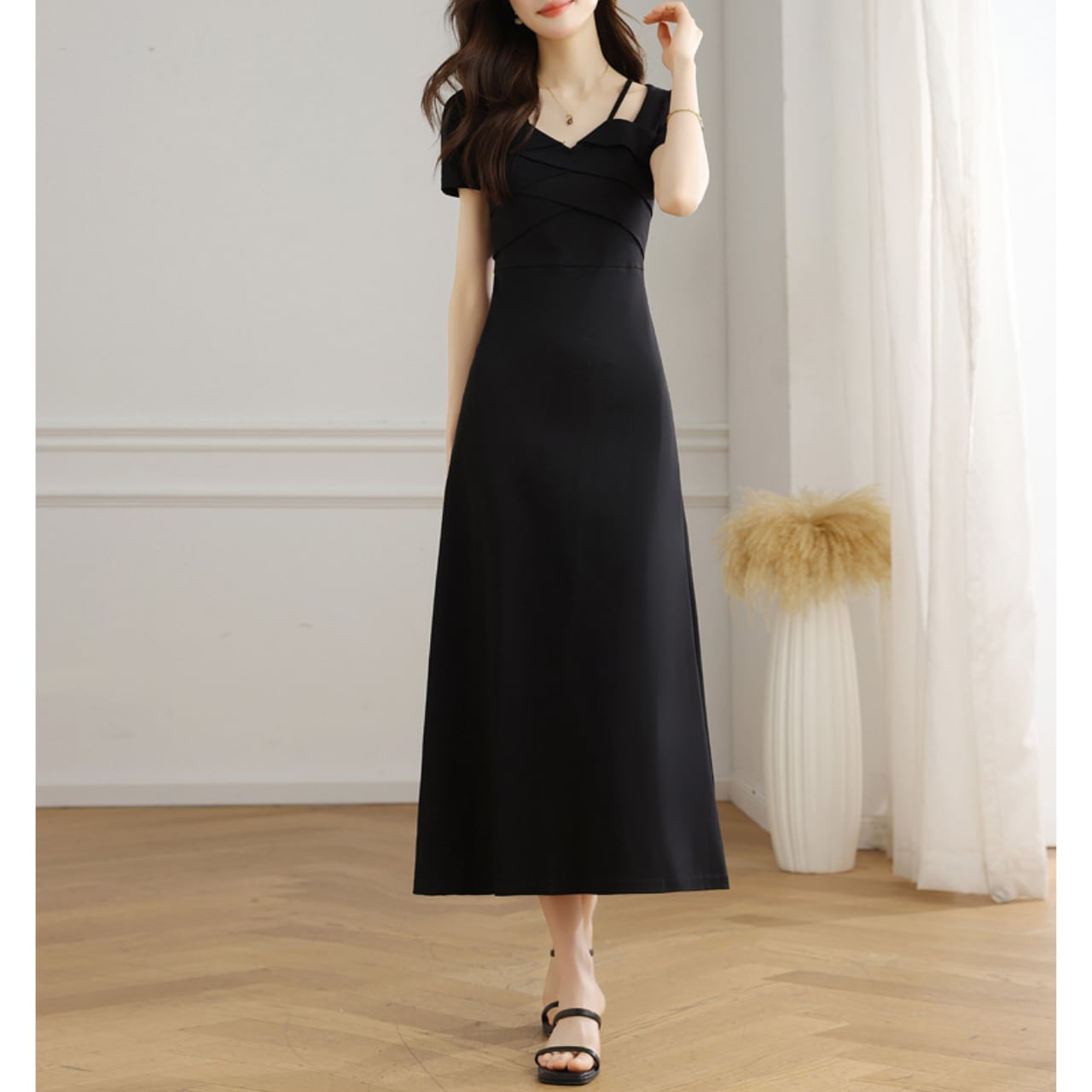 胸元のクロスデザインがさりげないアクセントとなり、洗練された印象を与えます。