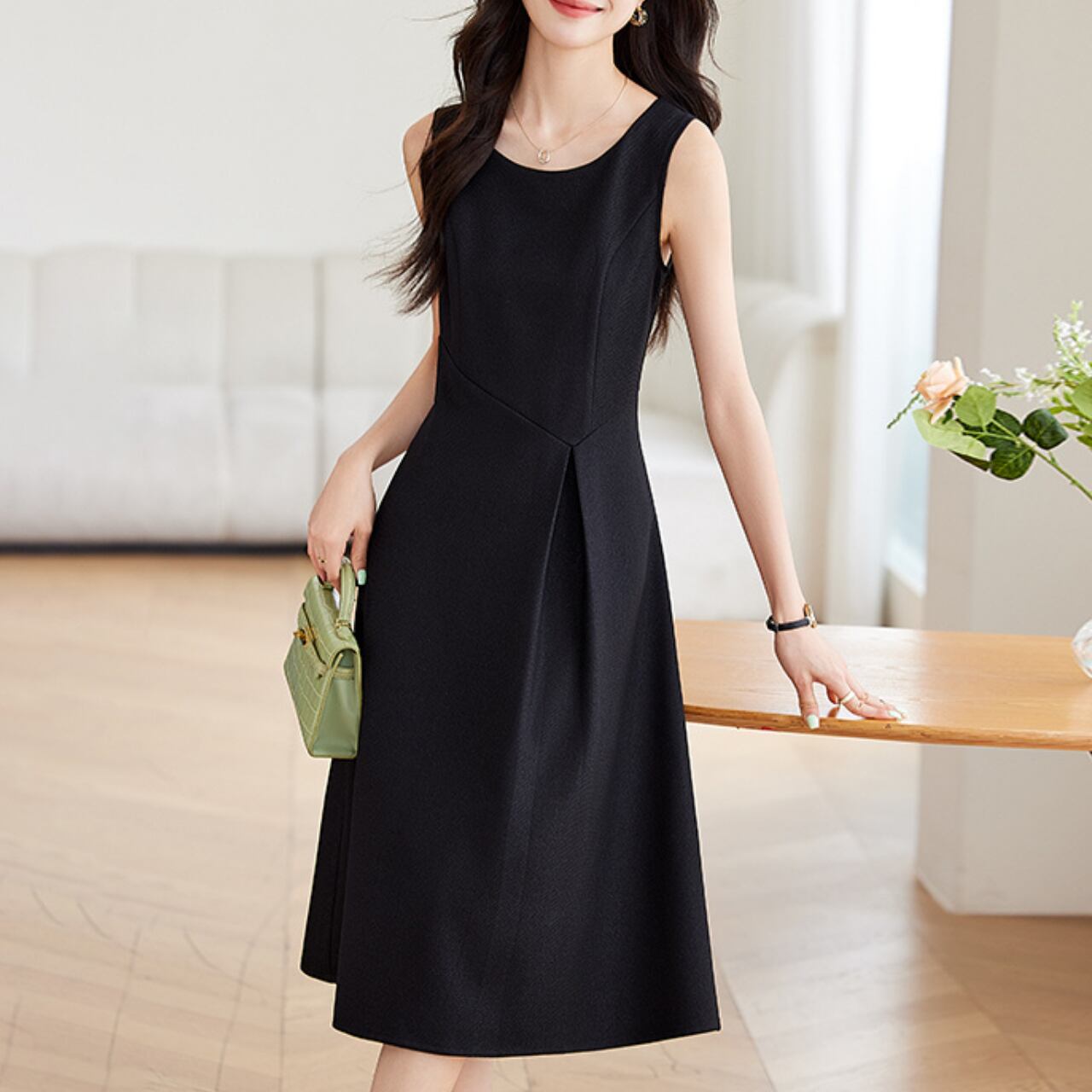 Aラインラウンドネックノースリーブワンピース Me1127