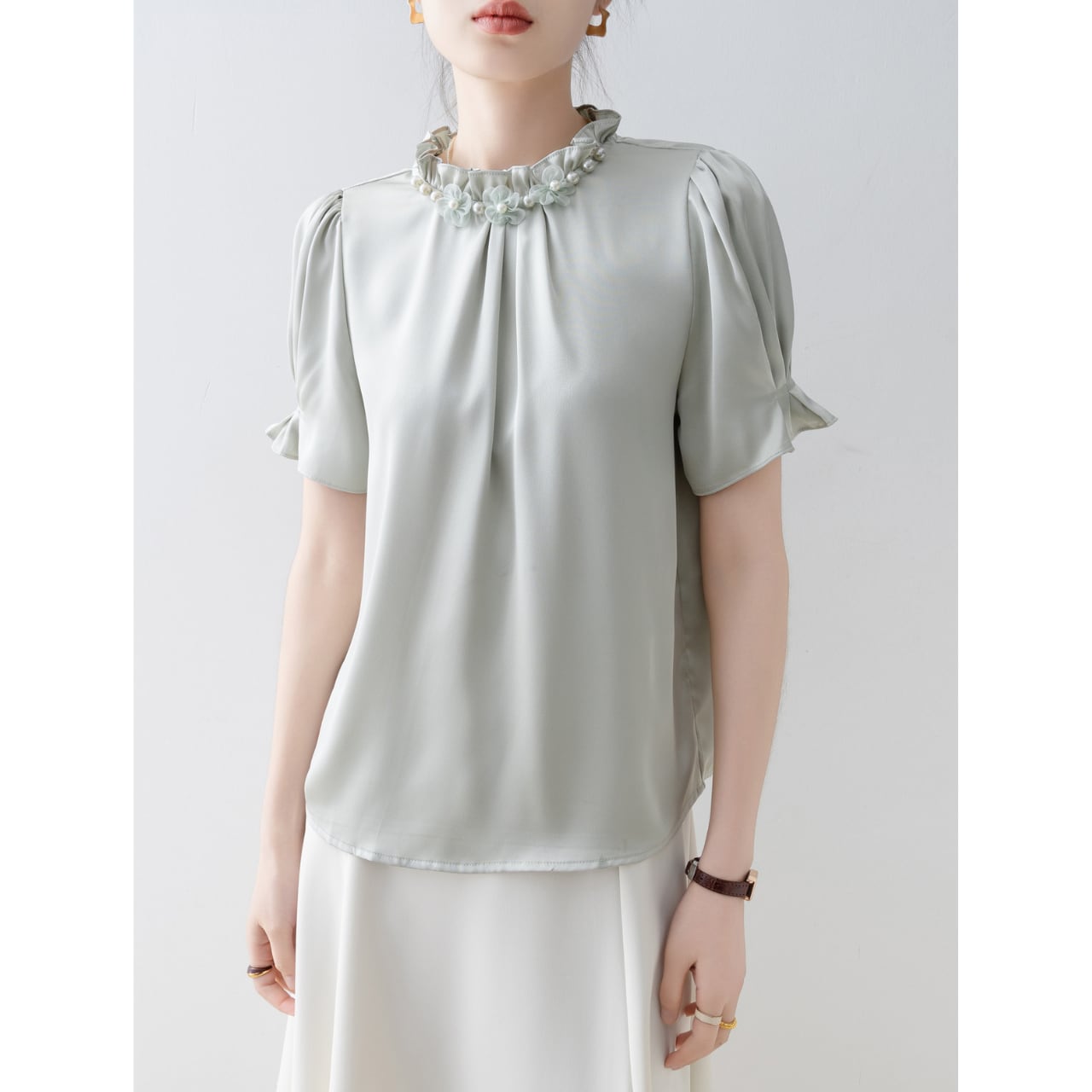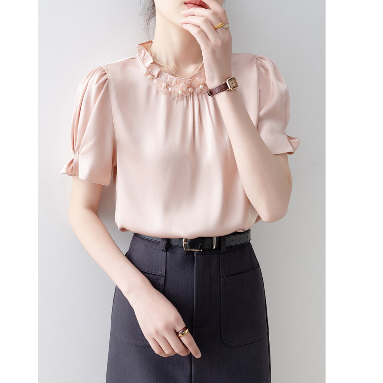 襟元のパール付きフラワーモチーフが上品な印象のブラウスです。