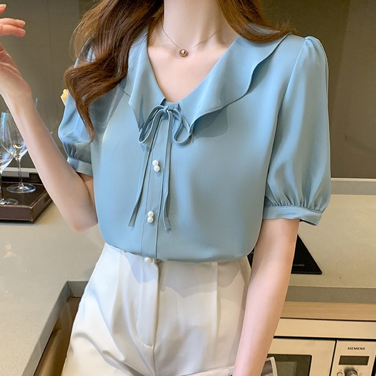 フリル襟が顔周りを華やかに彩り、女性らしい印象を与えます。