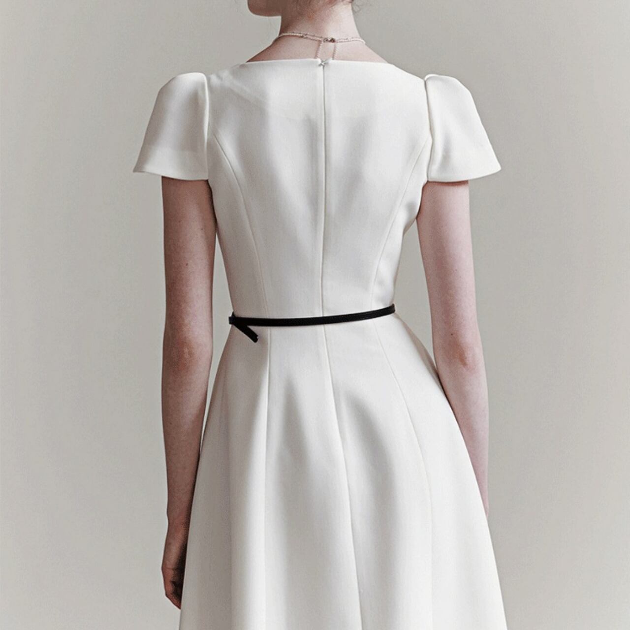 ラウンドネックとAラインシルエットがエレガントなワンピースです。