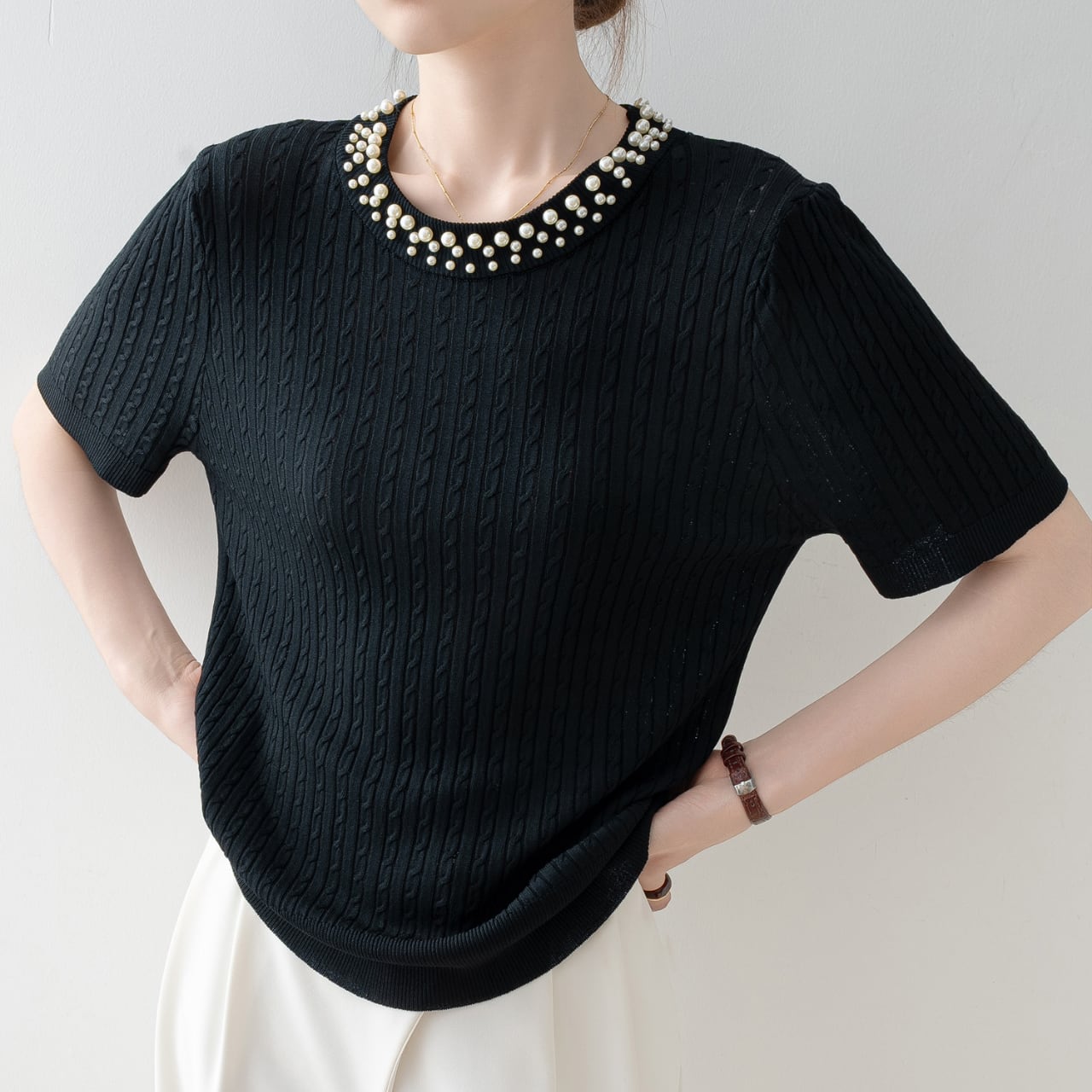 繊細なパールがあしらわれたネックラインが、女性らしさを引き立てるニットトップスです。
