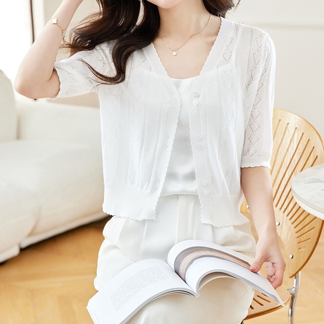 Vネックデザインとフラワーボタンが女性らしさを演出。