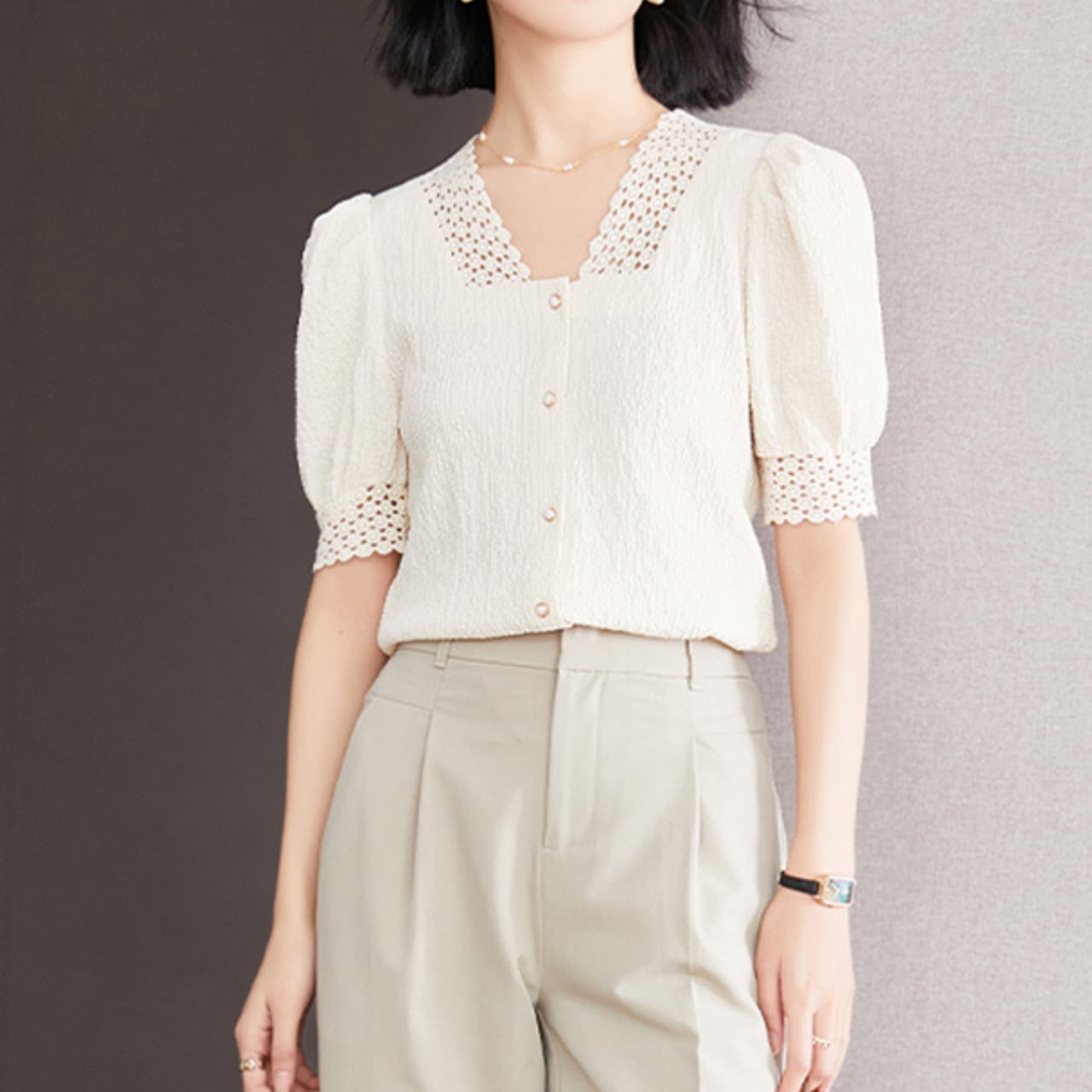 レース襟とパフスリーブがポイントのブラウスは、着るだけでフェミニンな雰囲気を演出します。