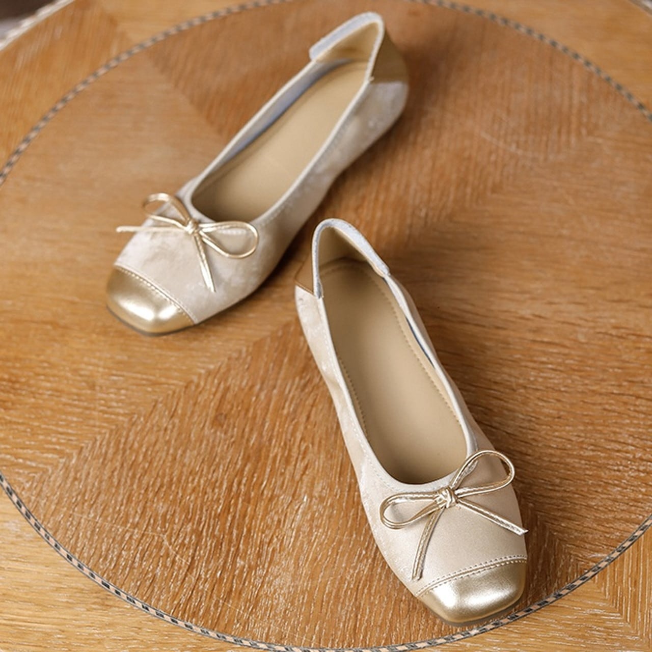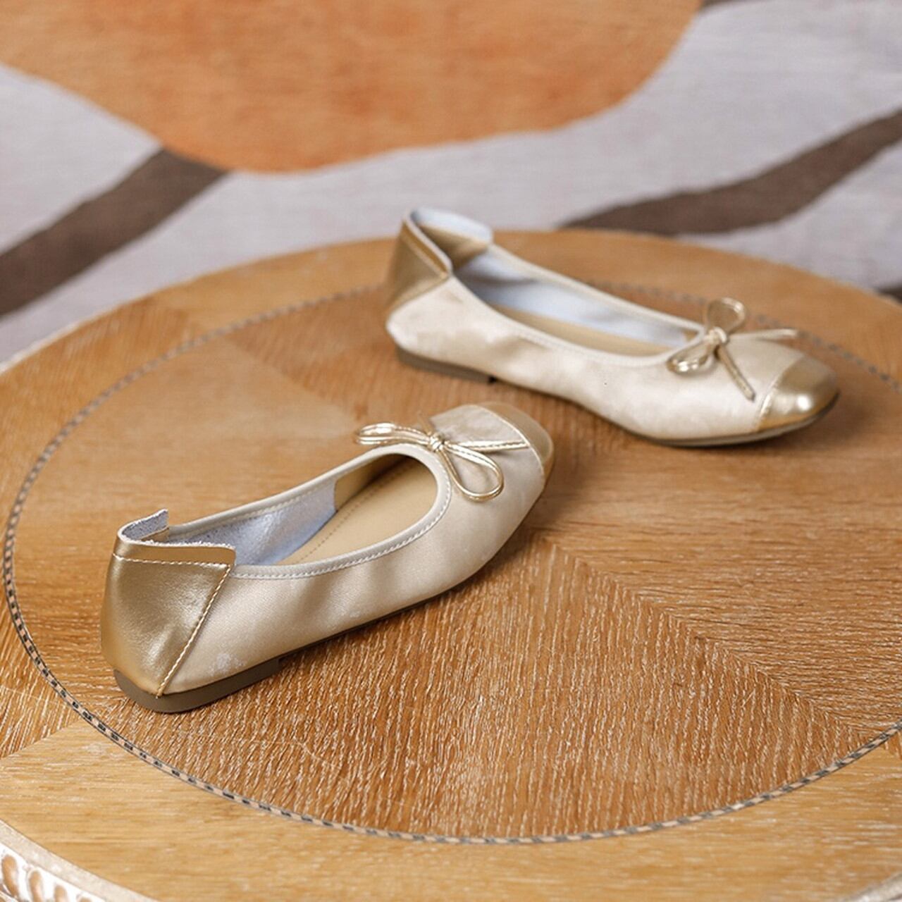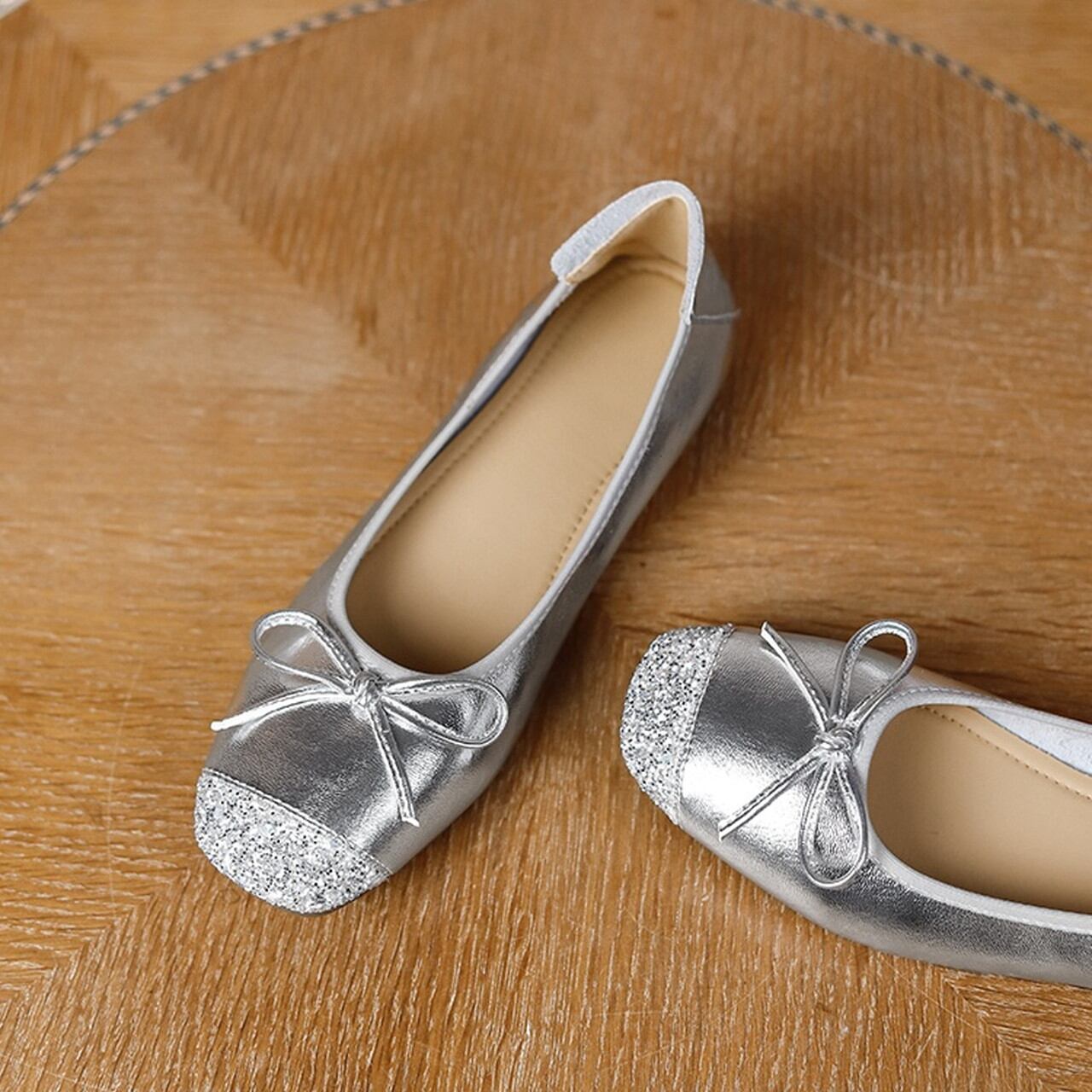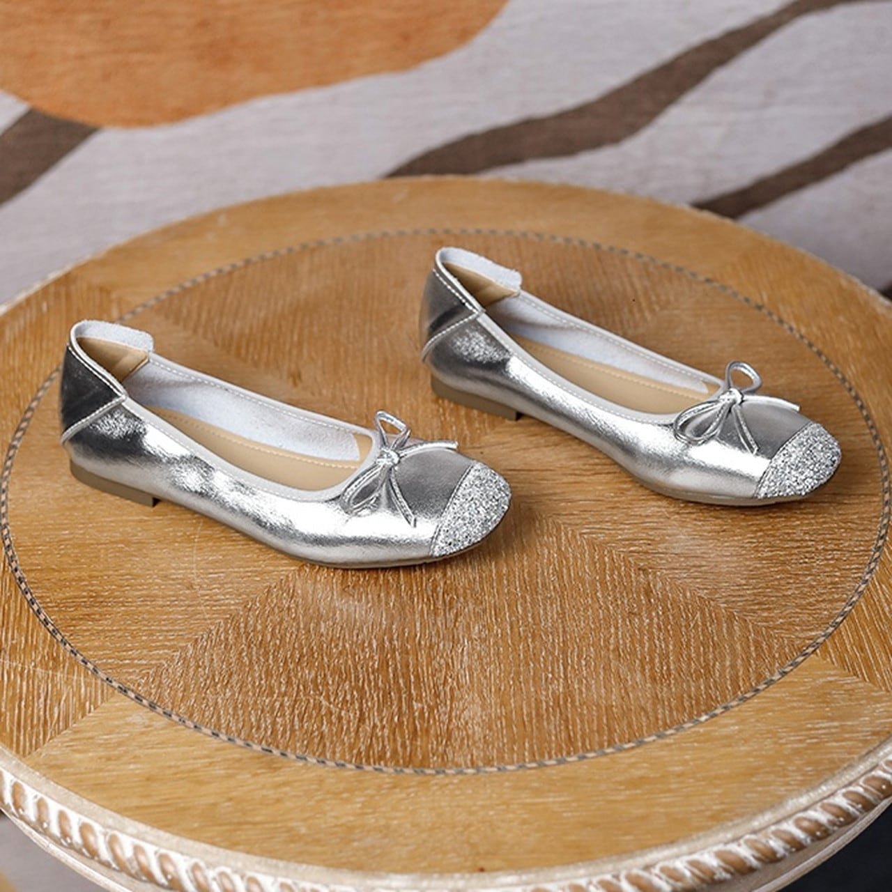 メタリックの輝くラウンドトゥのバレエシューズです。