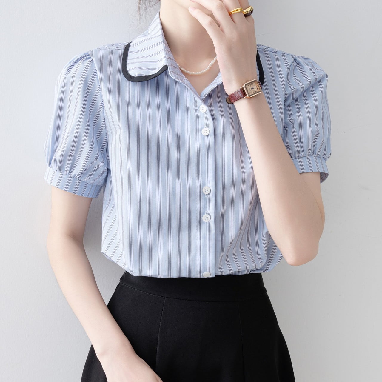 上品な襟のデザインとパフスリーブが女性らしいシルエットに。
