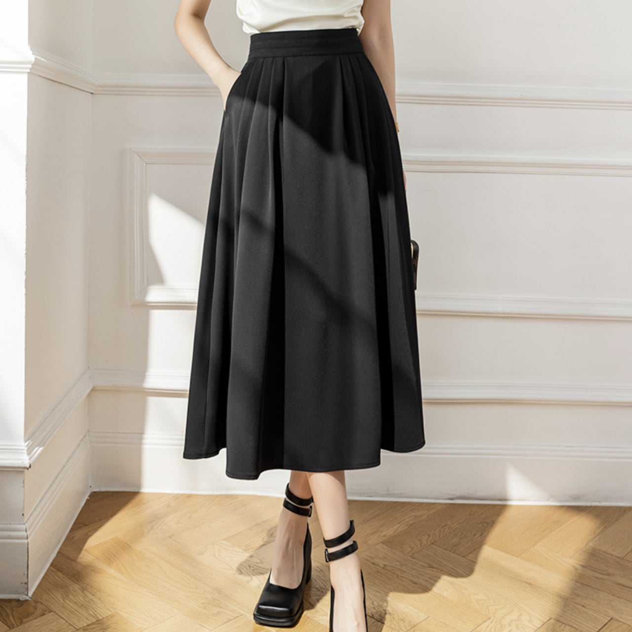 すっきりとしたハイウエストデザインと、女性らしいAラインシルエットの絶妙なバランスが魅力です。