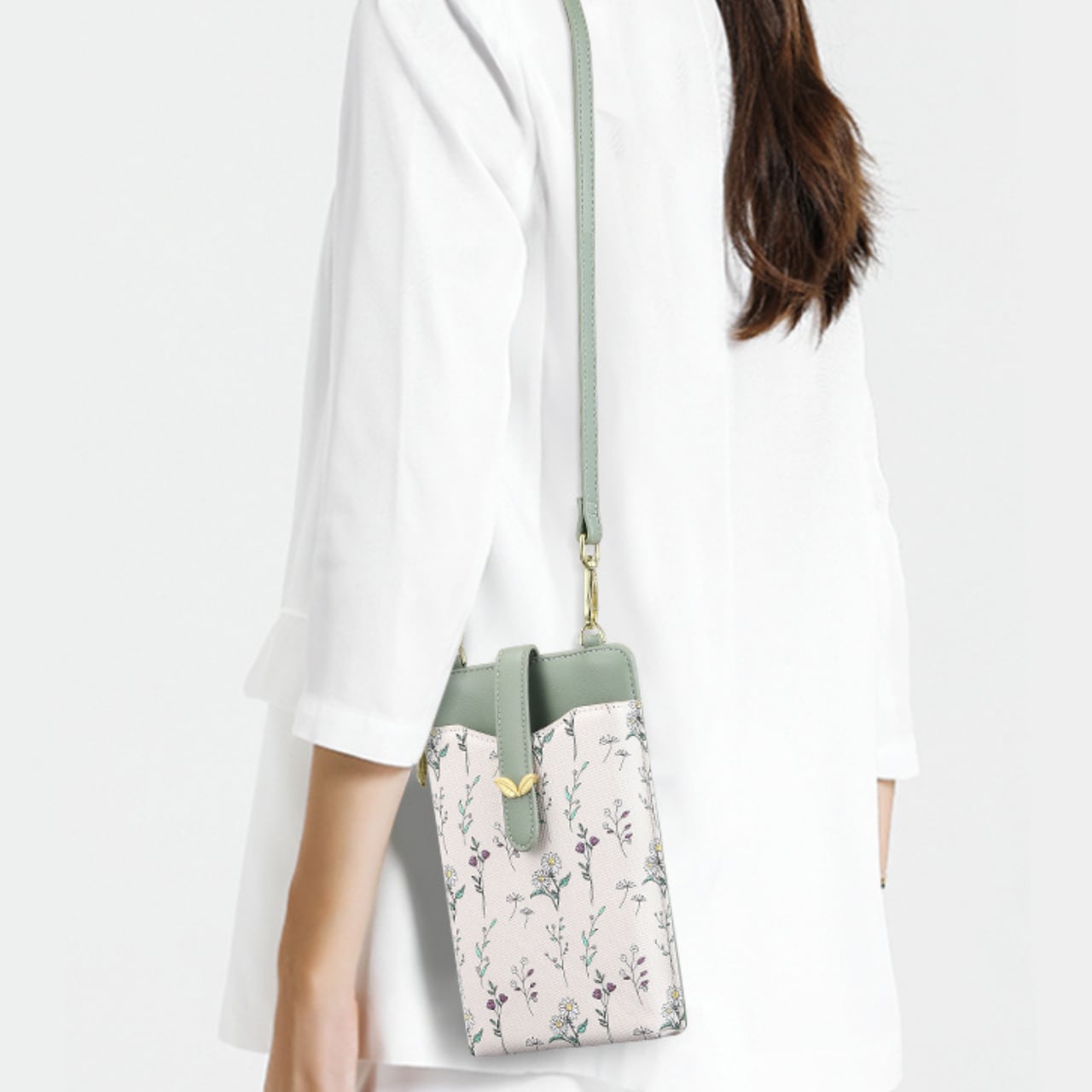 繊細な花柄プリントが目を引くスマホショルダーバッグです。