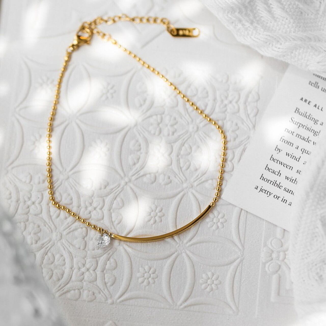 繊細なチェーンとメタルバーが上品なアンクレットです。