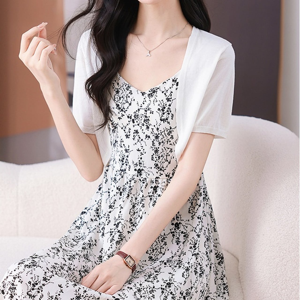 カジュアルなワンピースやブラウスの上から羽織れば上品な印象に。