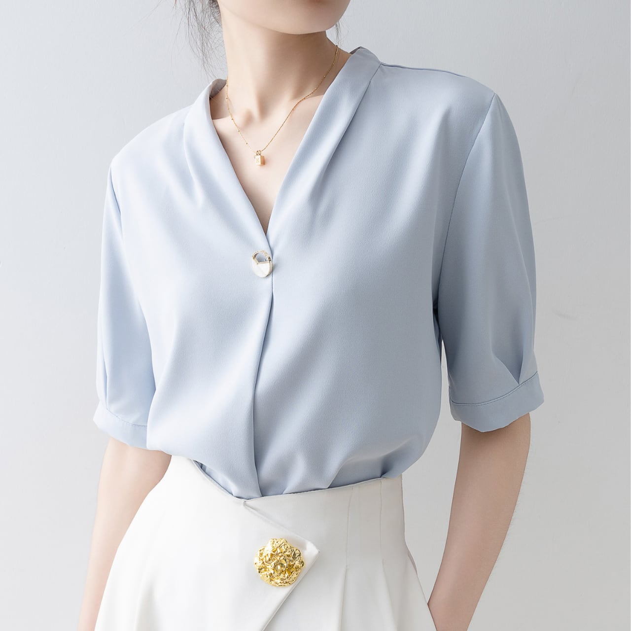洗練されたVネックがデコルテを美しく見せるブラウスです。