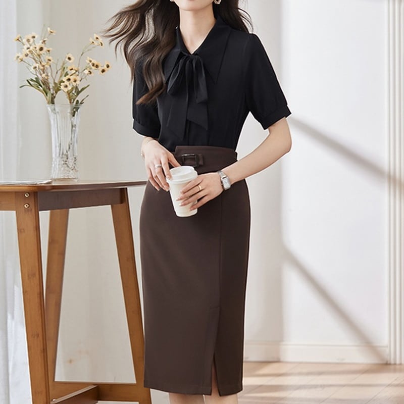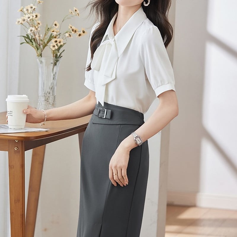 首元にはリボンタイをあしらい、クラシカルかつ可愛らしいアクセントに。