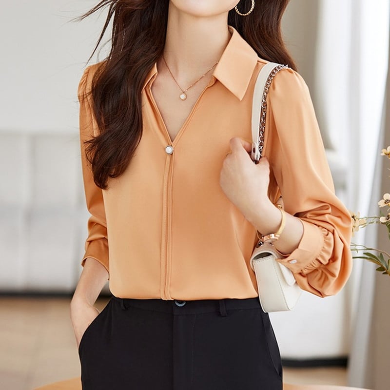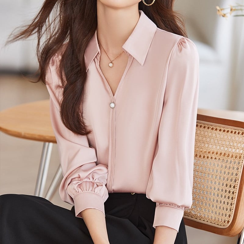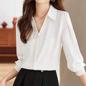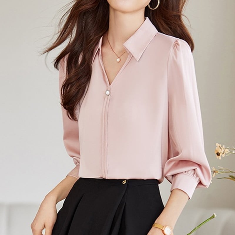 スキッパー襟と上品なパールが魅力的なブラウスです。