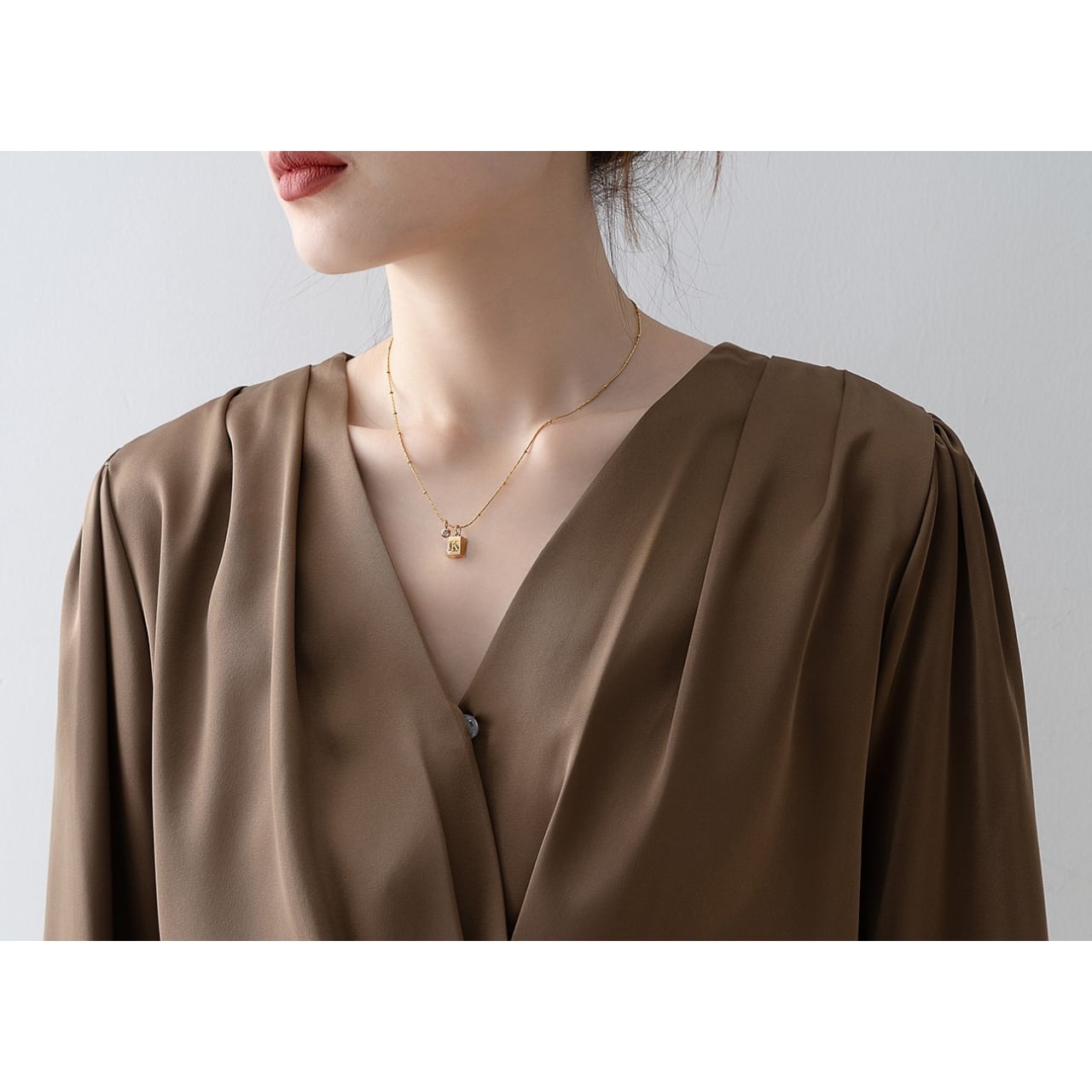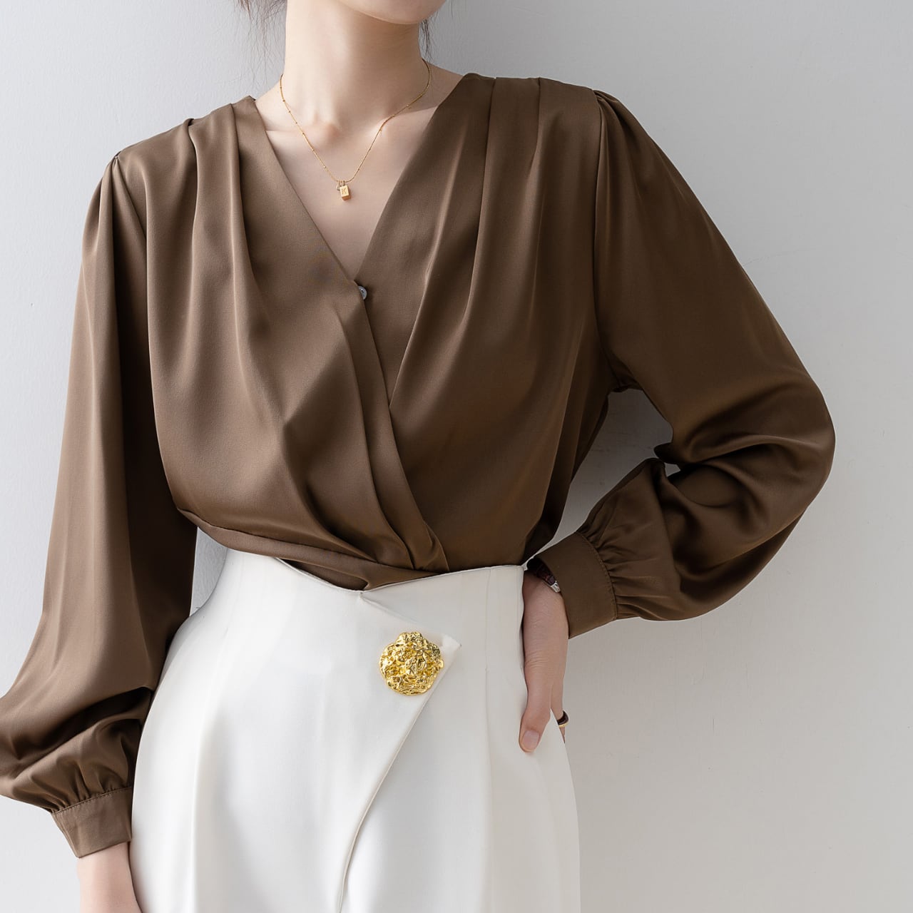 さりげない光沢感と美しいドレープが魅力的で、オフィスシーンからデートまで、幅広いシーンで活躍します。