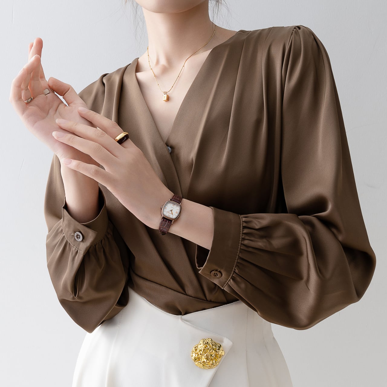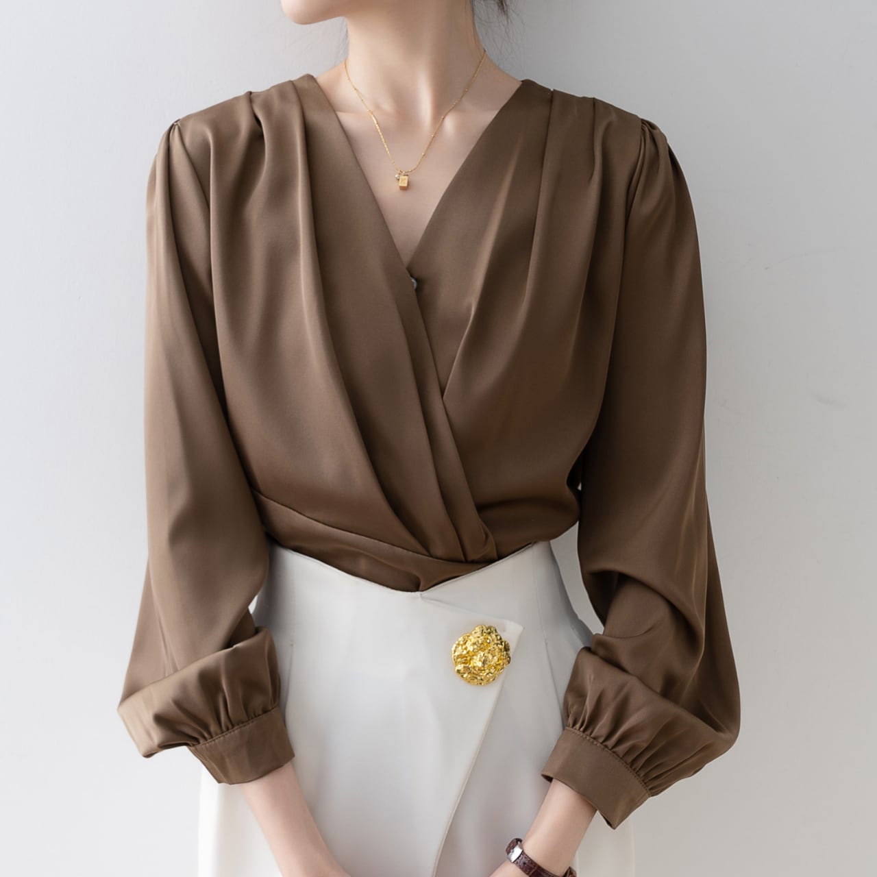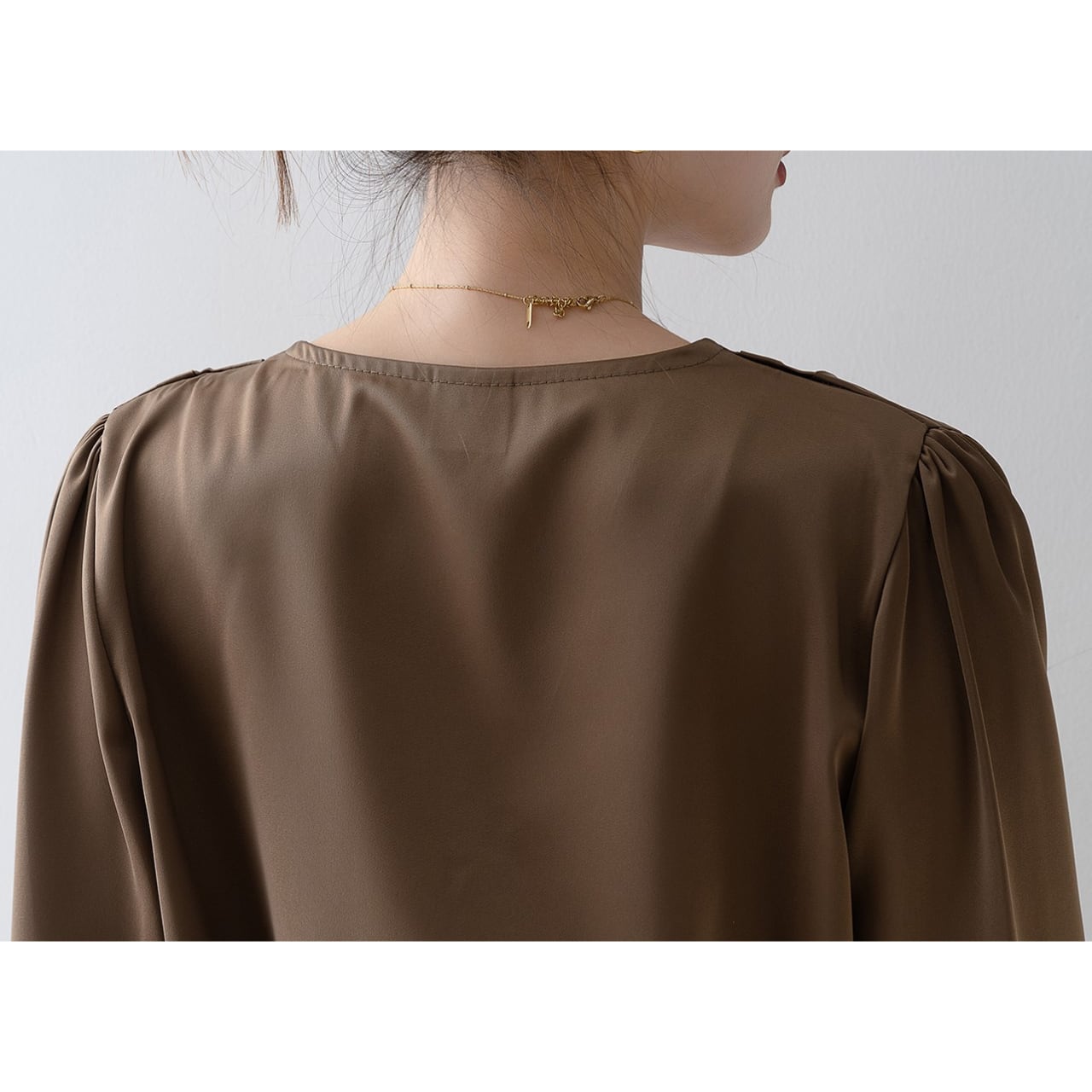 サテンVネックパフスリーブブラウス Me1446