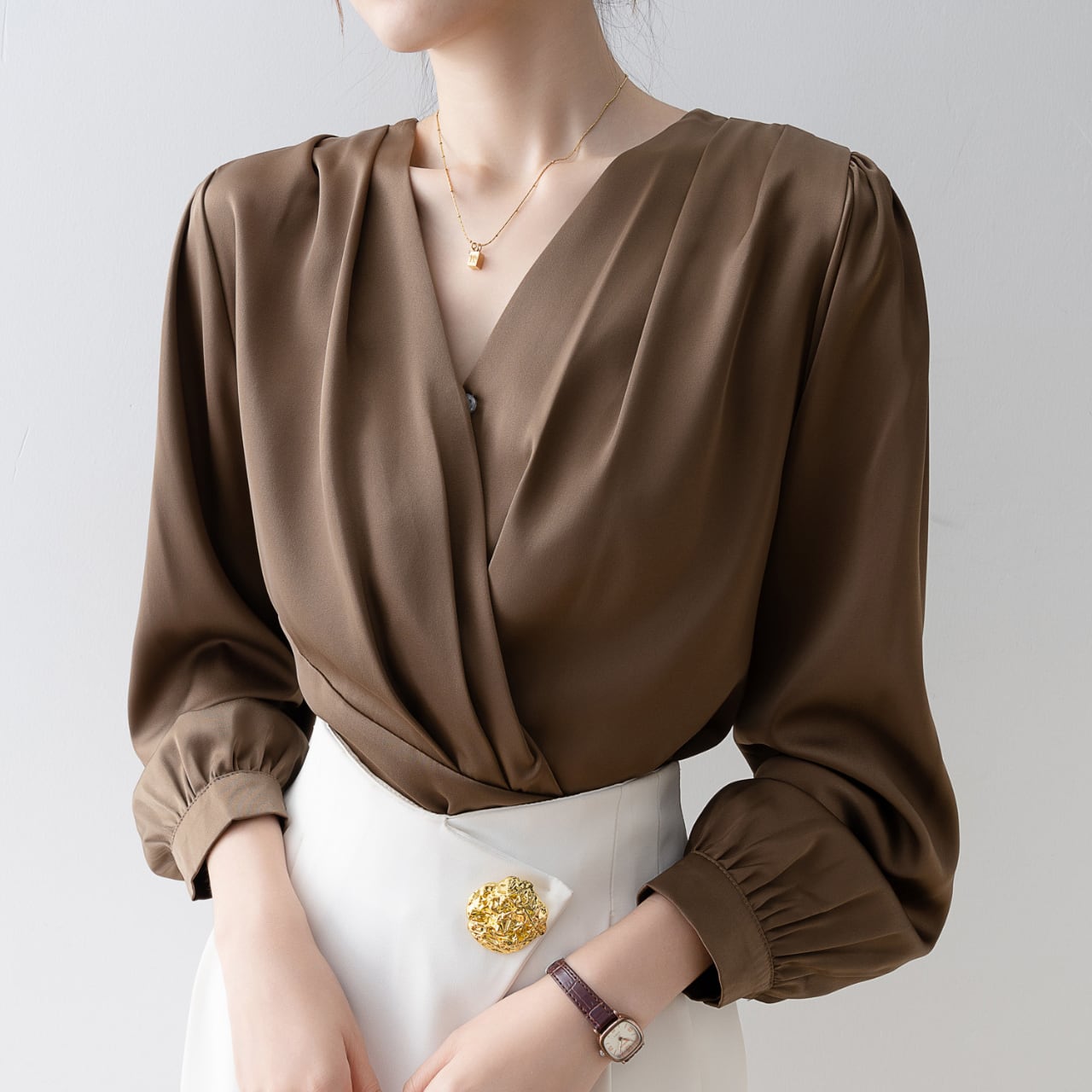 Vネックデザインとパフスリーブが、女性らしい洗練された雰囲気を演出するブラウスです。