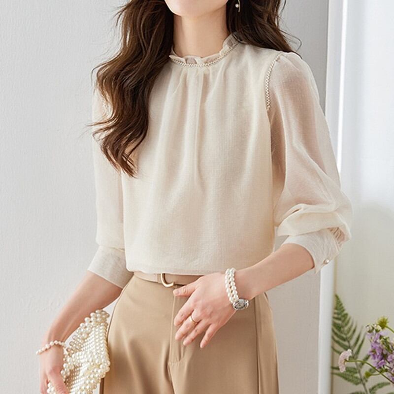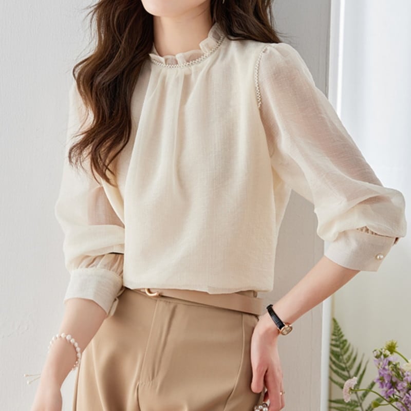 フリル襟でハイネックデザインが女性らしいブラウスです。
