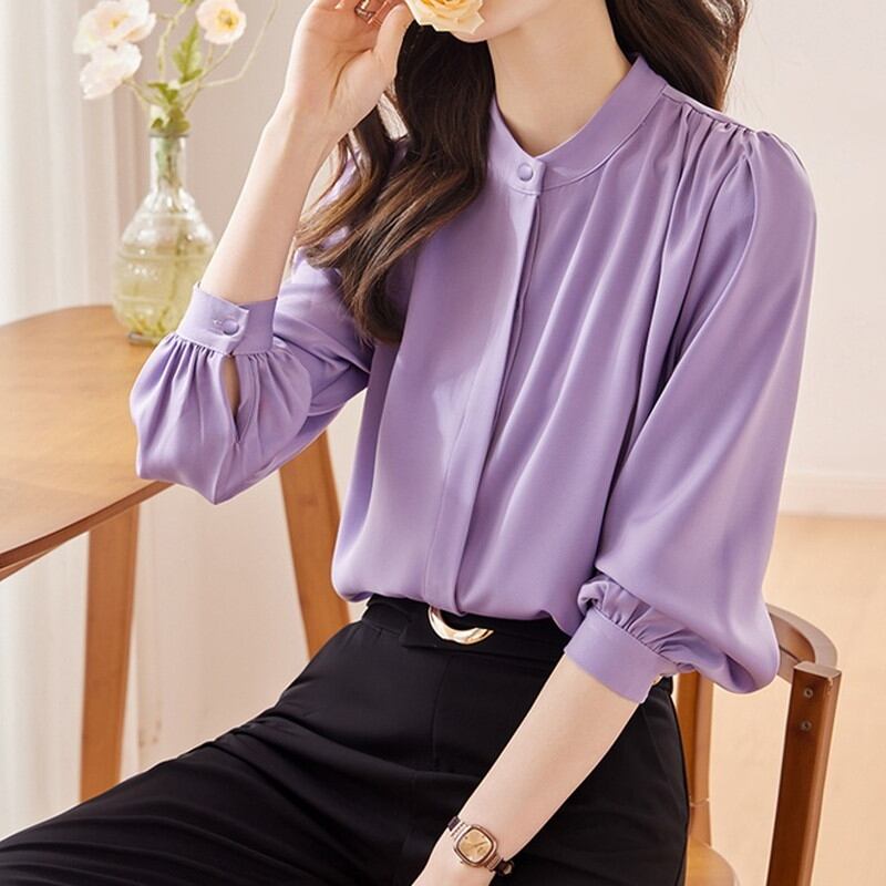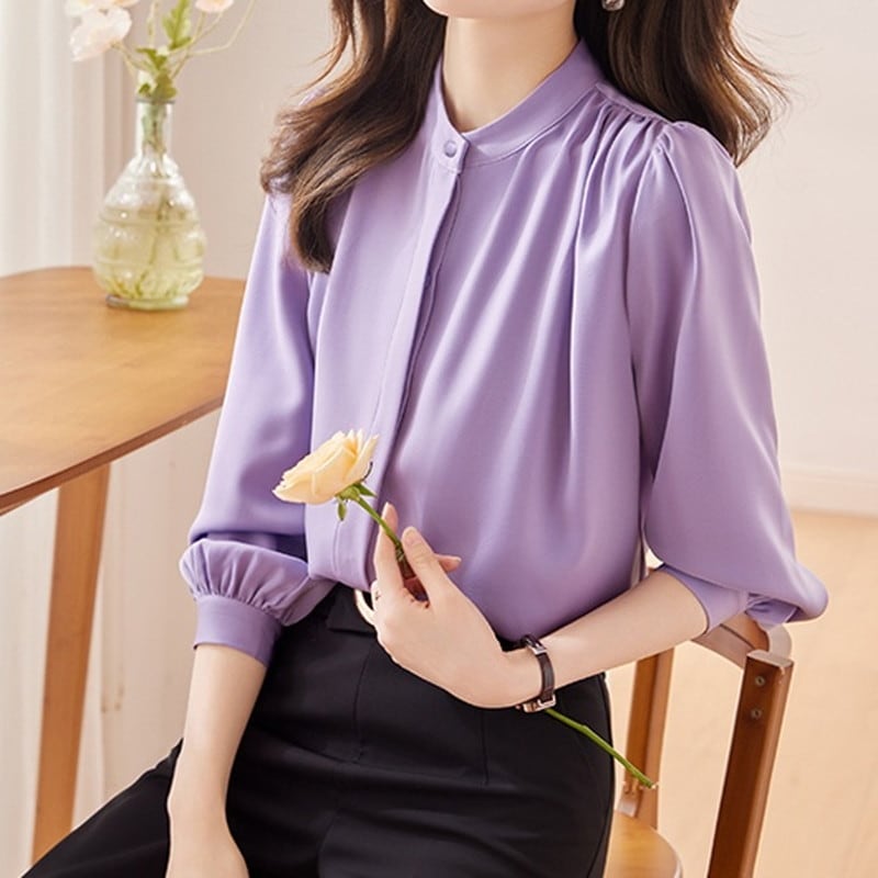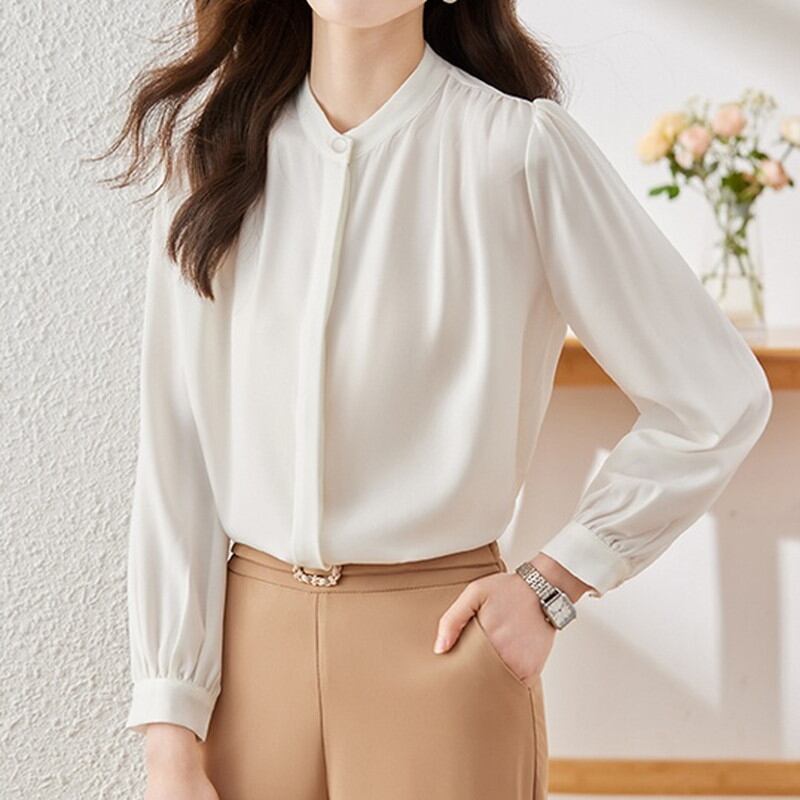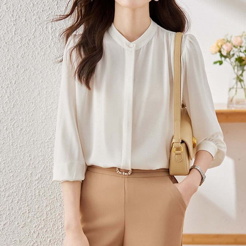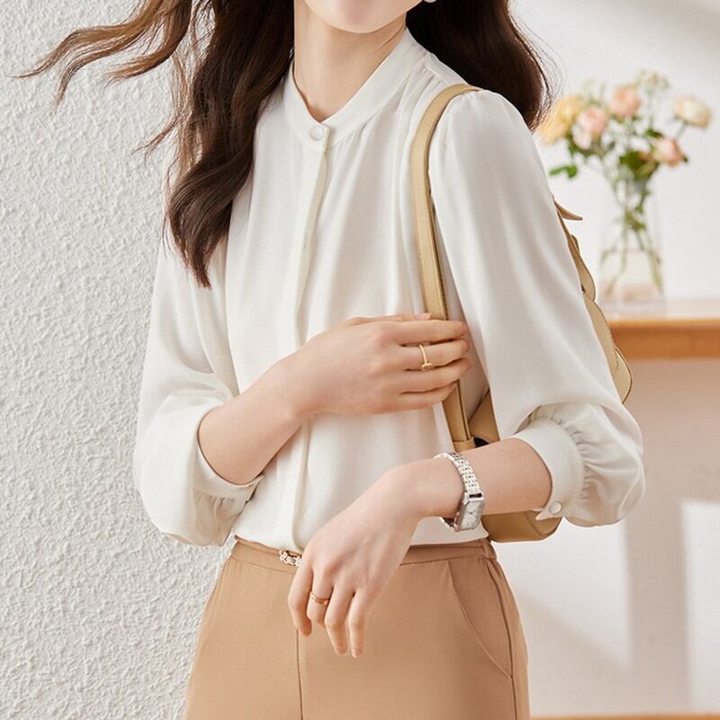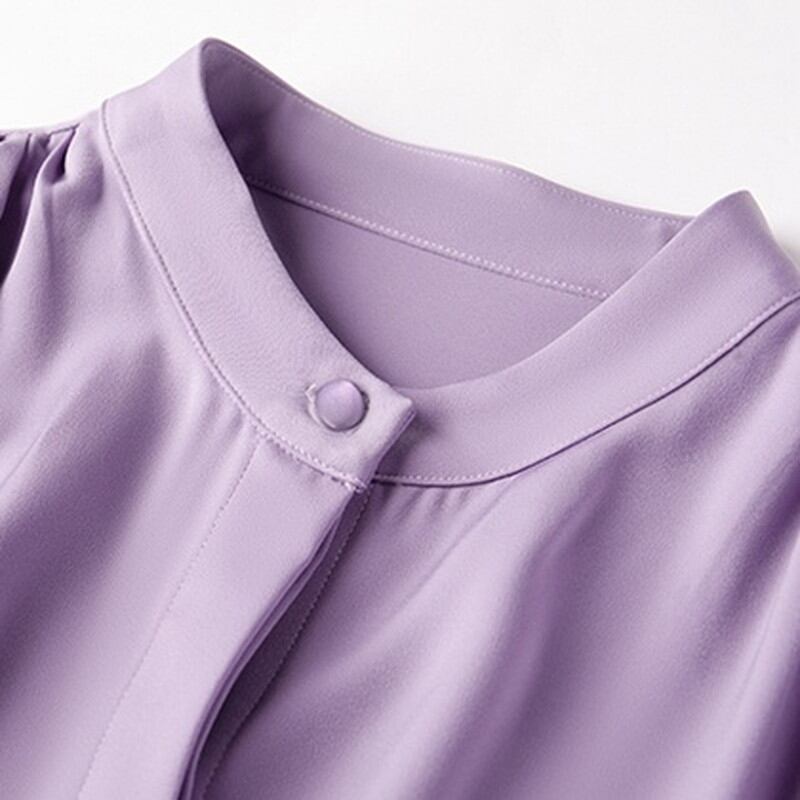 首元はすっきりとしたバンドカラーで、オフィスシーンにもぴったり。