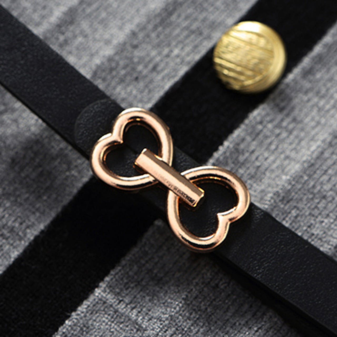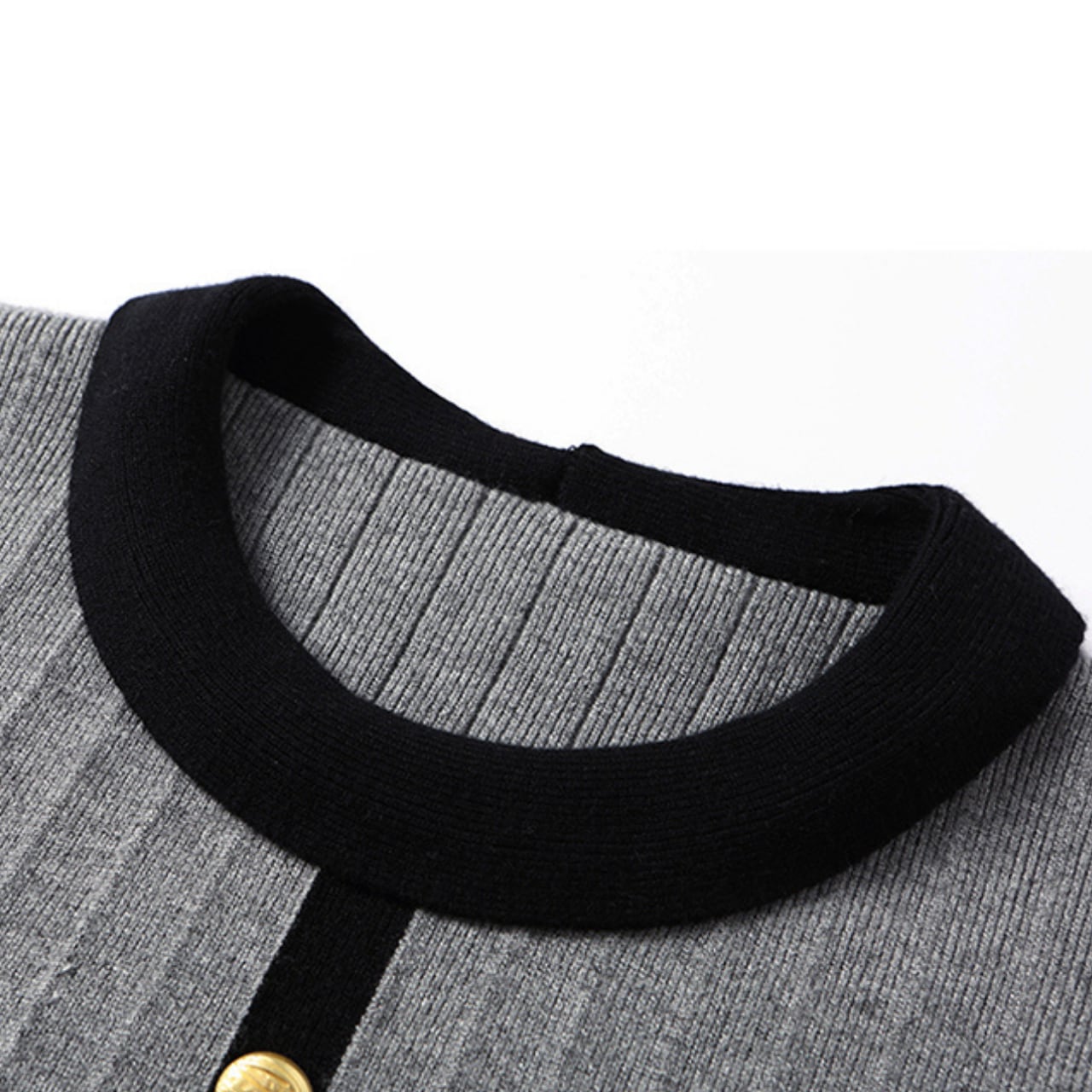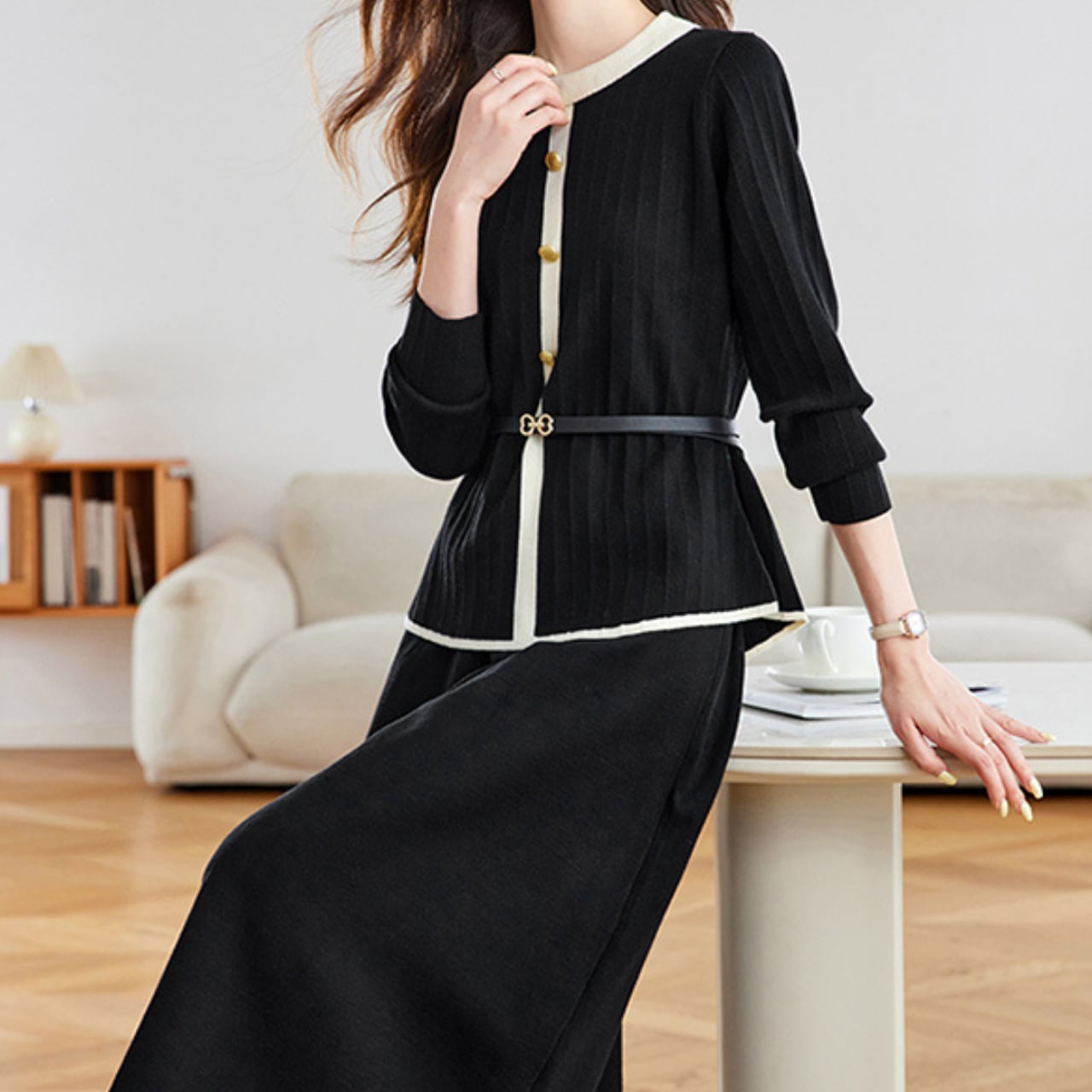 ラウンドネックのニットトップスは、ボタンとベルトがアクセントになり、シンプルながらも洗練された印象を与えます。