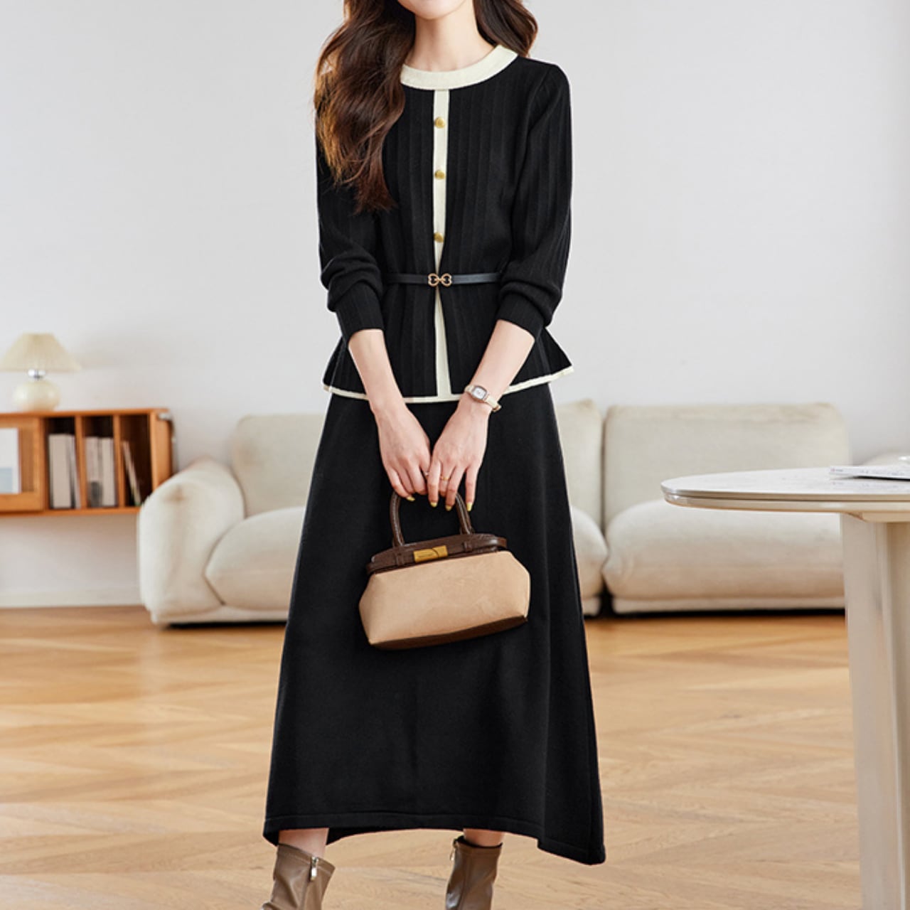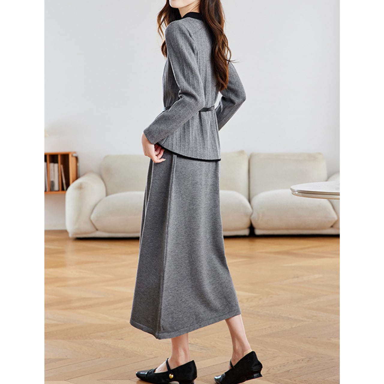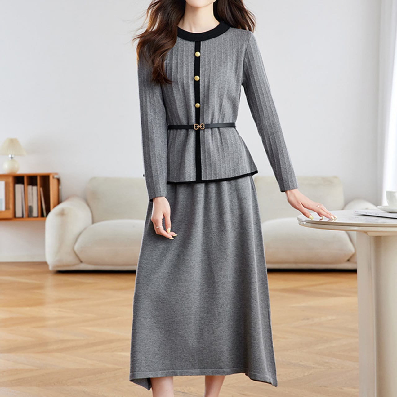 ベルト付きラウンドネックニットトップス&スカート2点セット Me1487