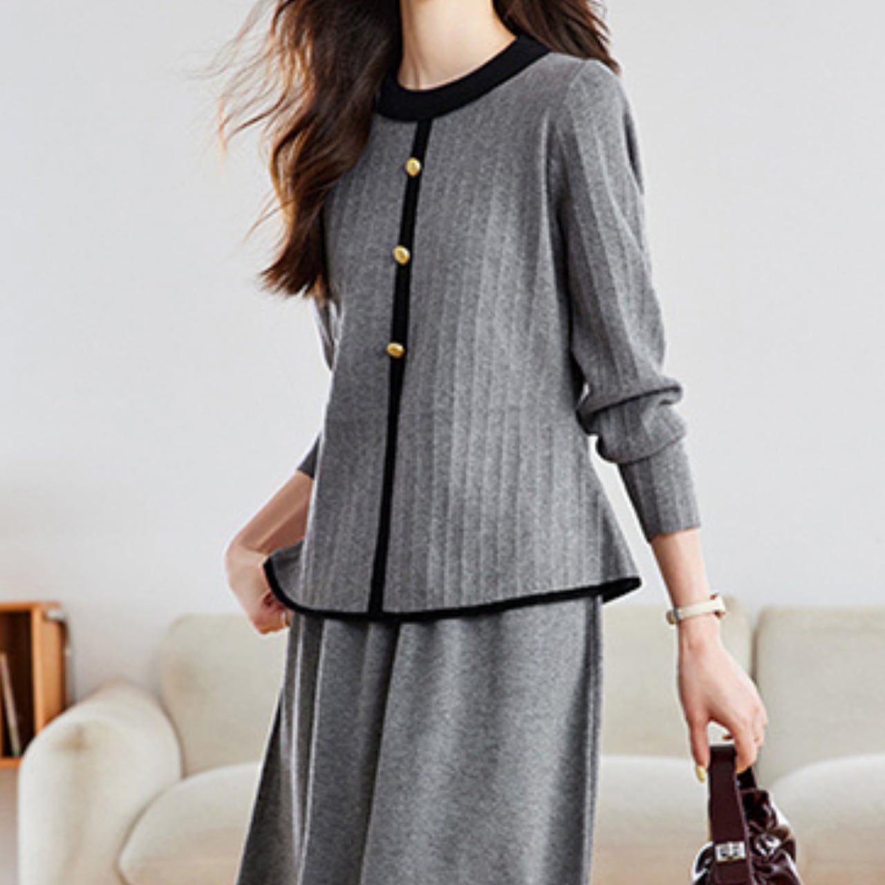 上品なニットトップスとスカートの2点セットです。