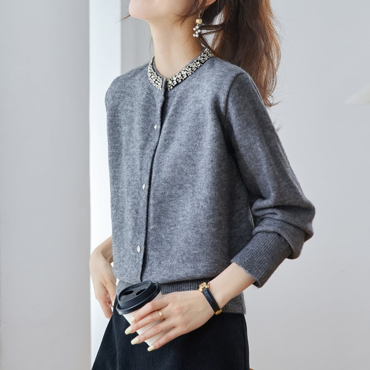 首元に施されたビジューが目を惹くカーディガンです。