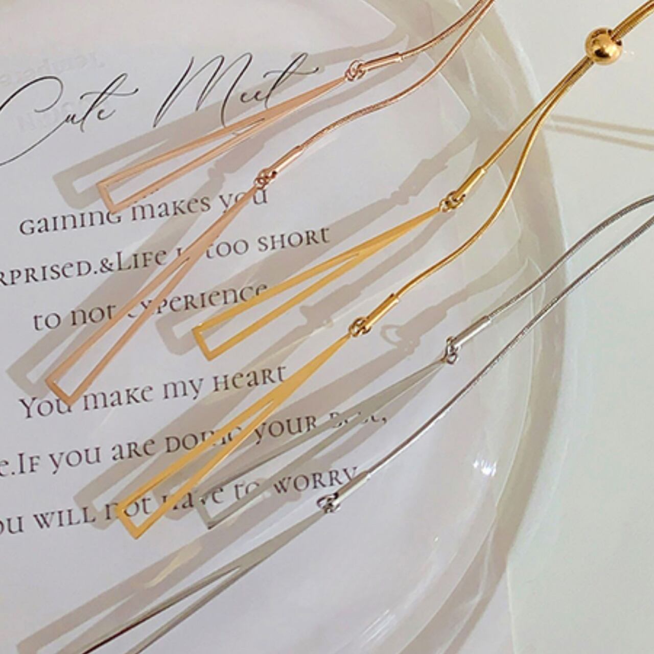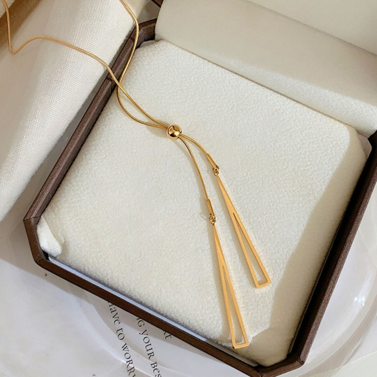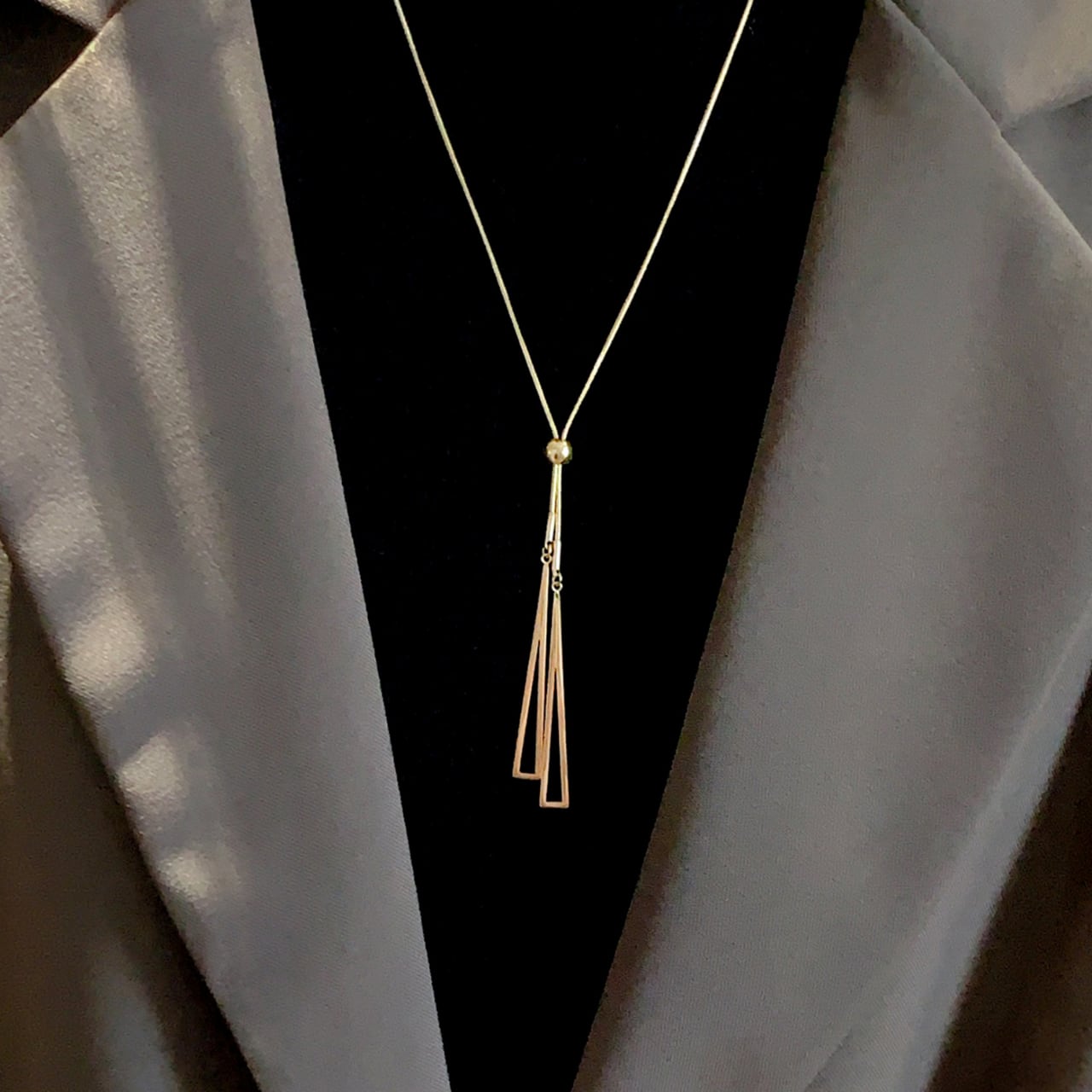 トライアングルモチーフが胸元をさりげなく彩り、どんなスタイルにも合わせやすいアイテムです。