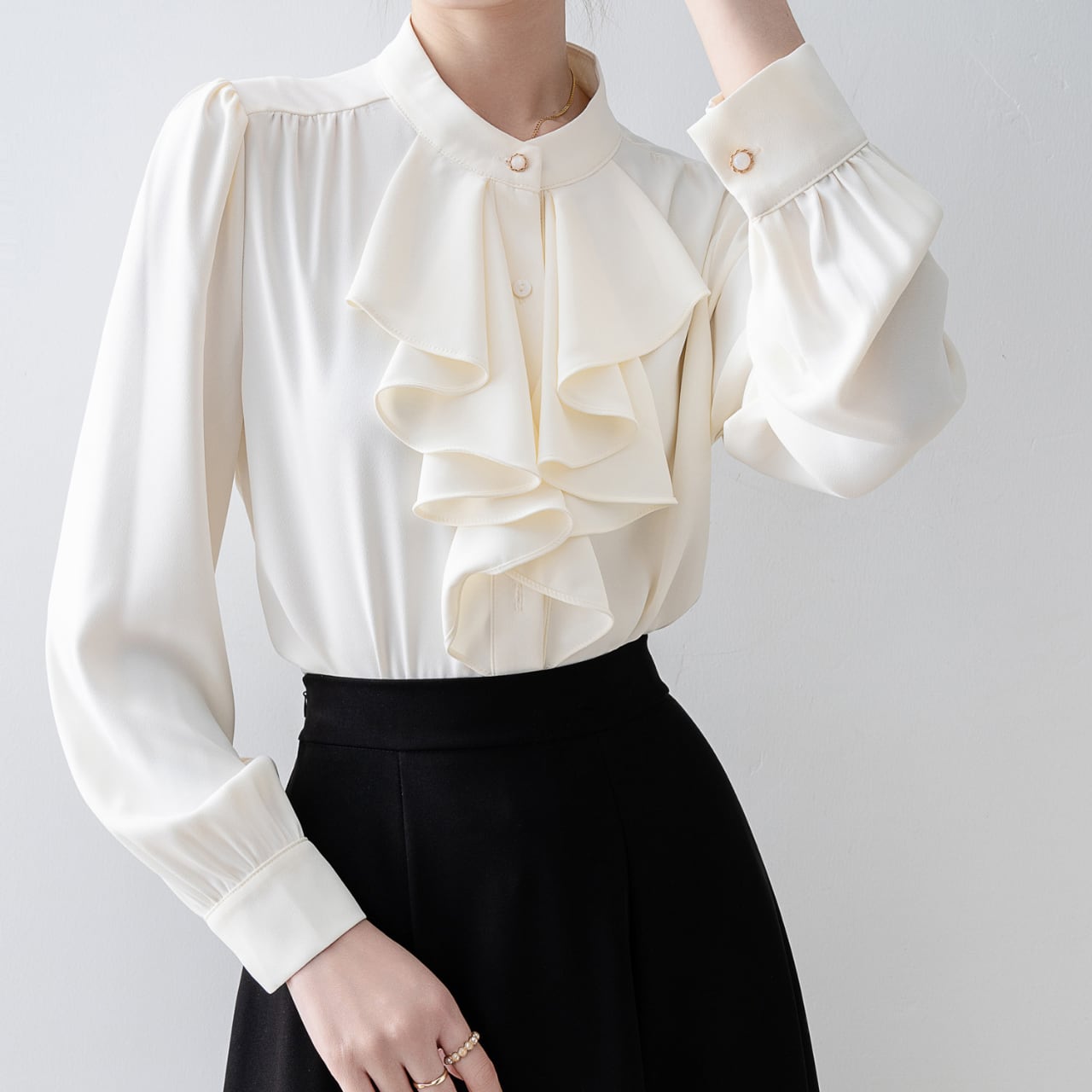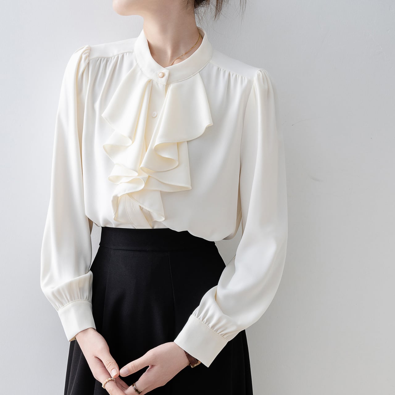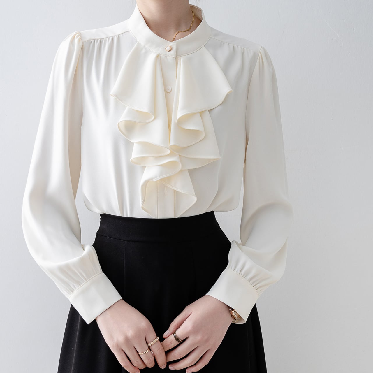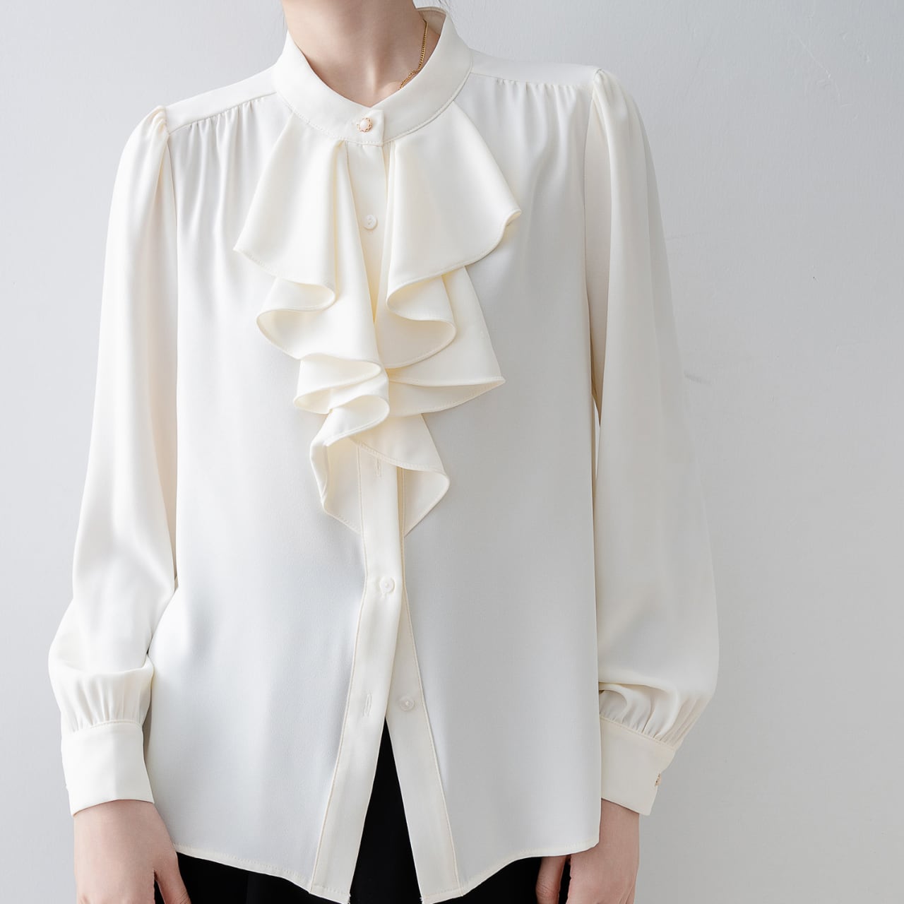程よくボリュームのあるラッフルは、顔周りを華やかに彩り、上品な印象を与えてくれます。