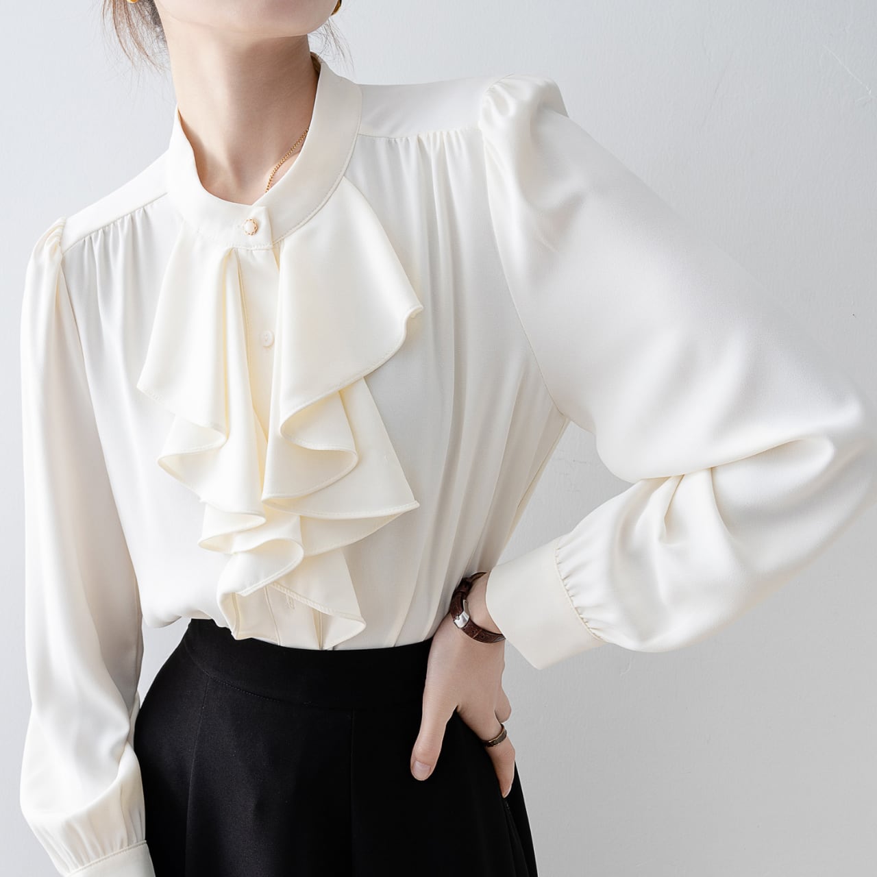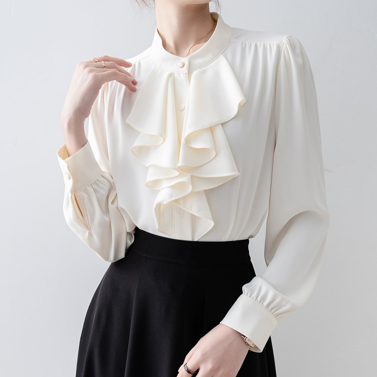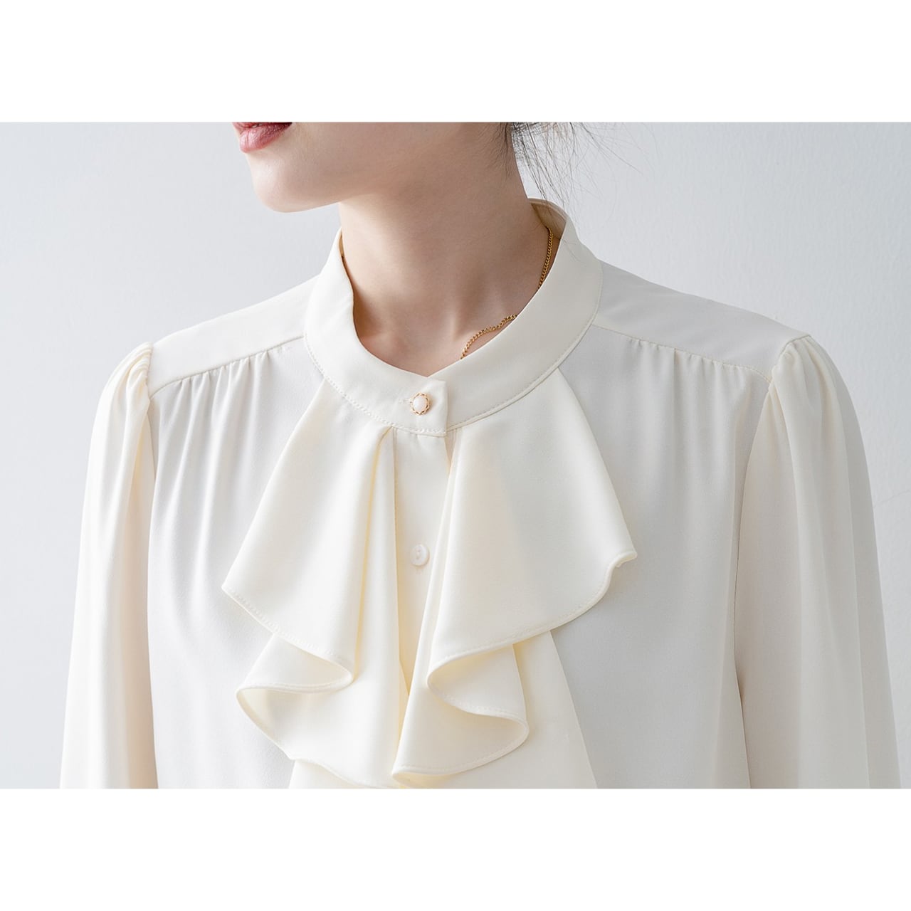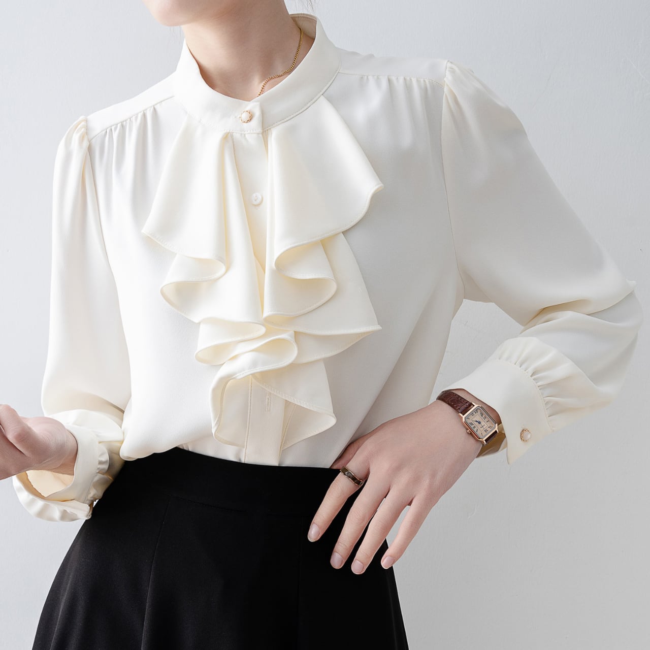 程よくボリュームのあるラッフルは、顔周りを華やかに彩り、上品な印象を与えてくれます。