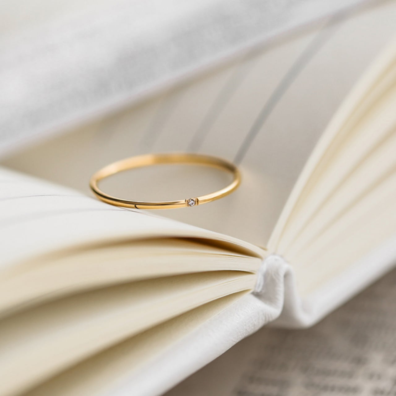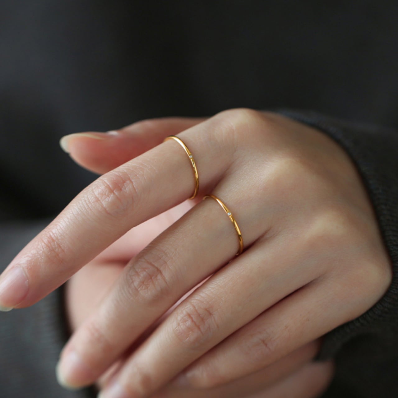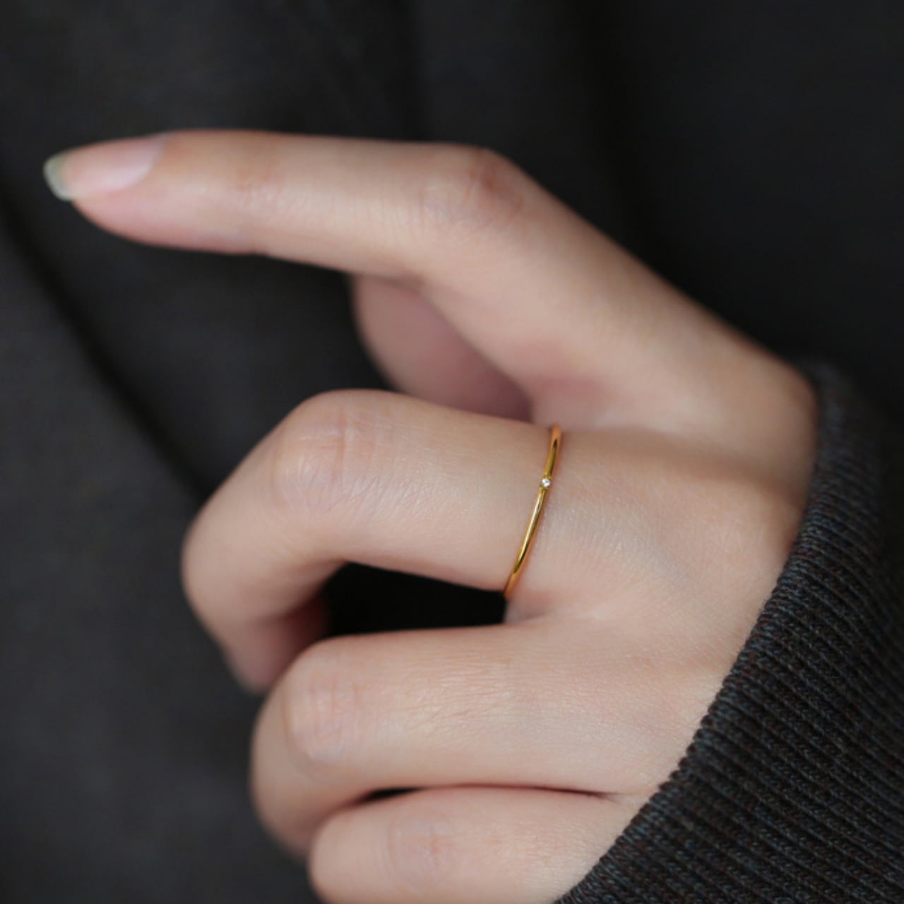 華奢なゴールドのラインが指先を美しく飾る、シンプルなナローリングです。