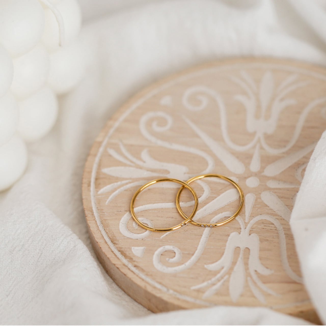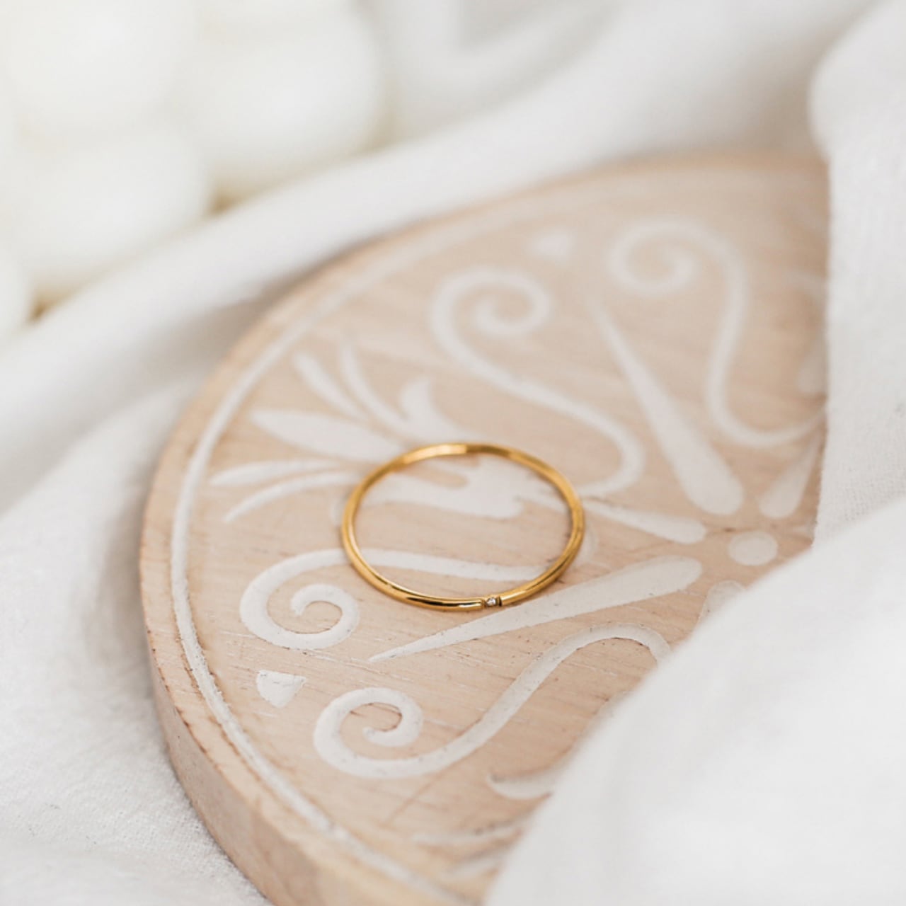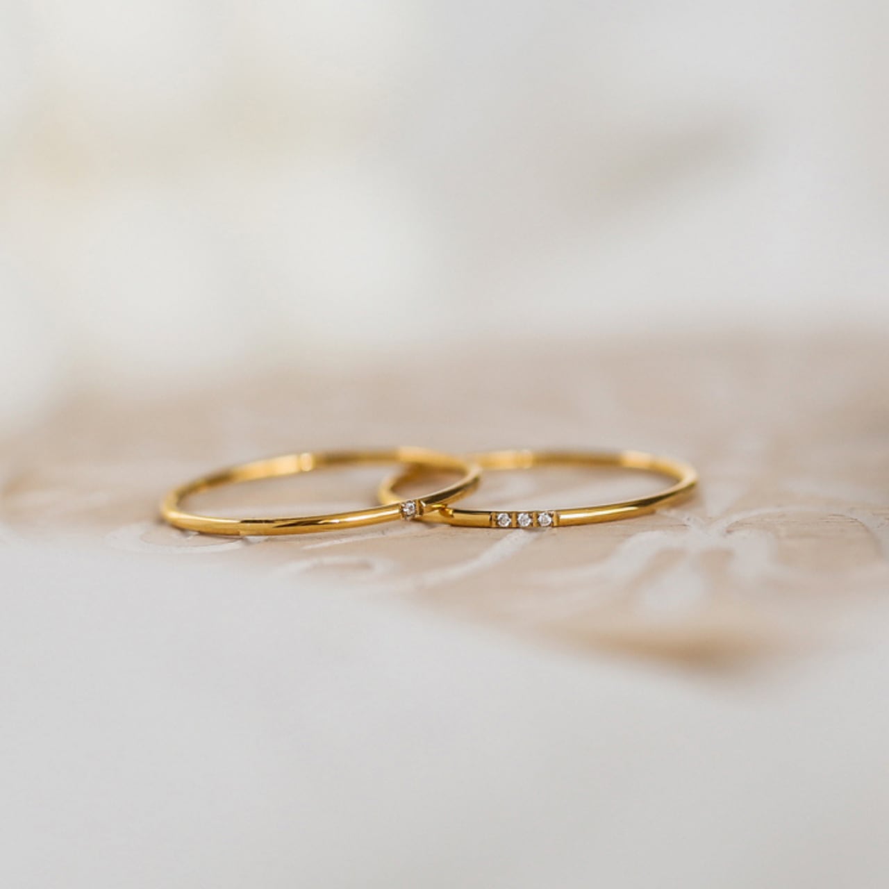 華奢なゴールドのラインが指先を美しく飾る、シンプルなナローリングです。