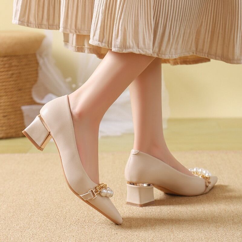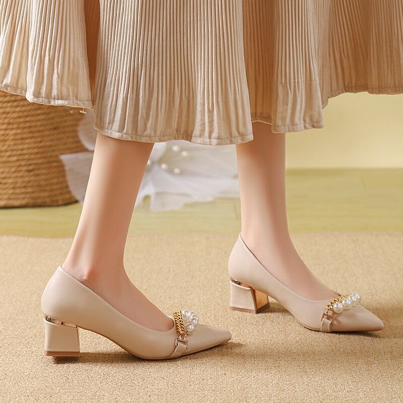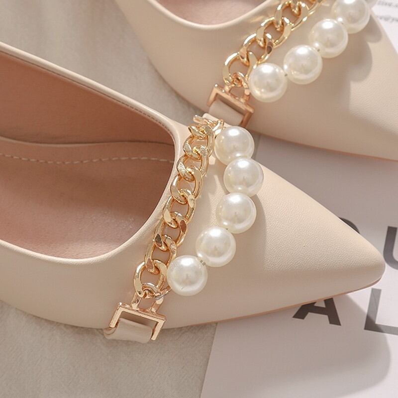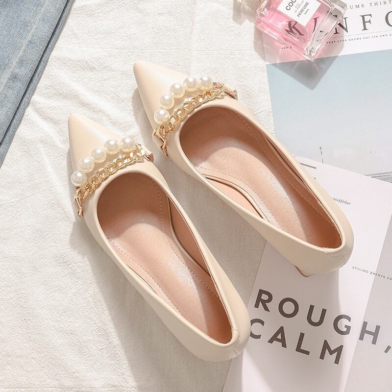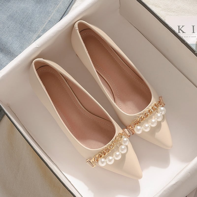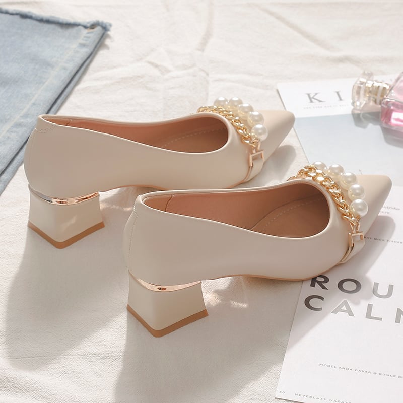 フェイクパールとゴールドチェーンの装飾が上品なポインテッドトゥパンプスです。