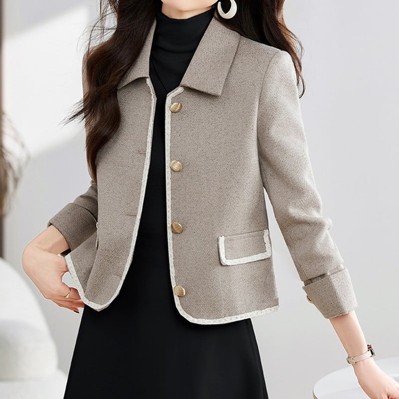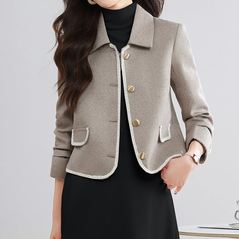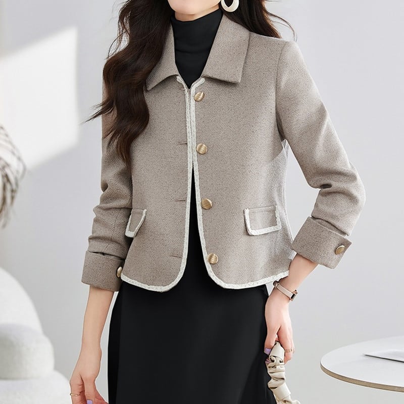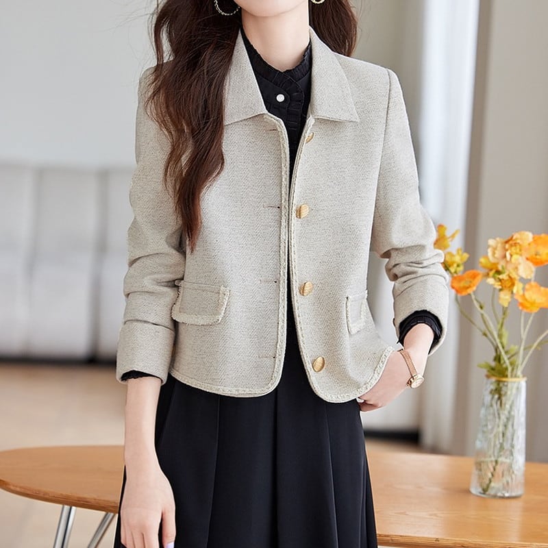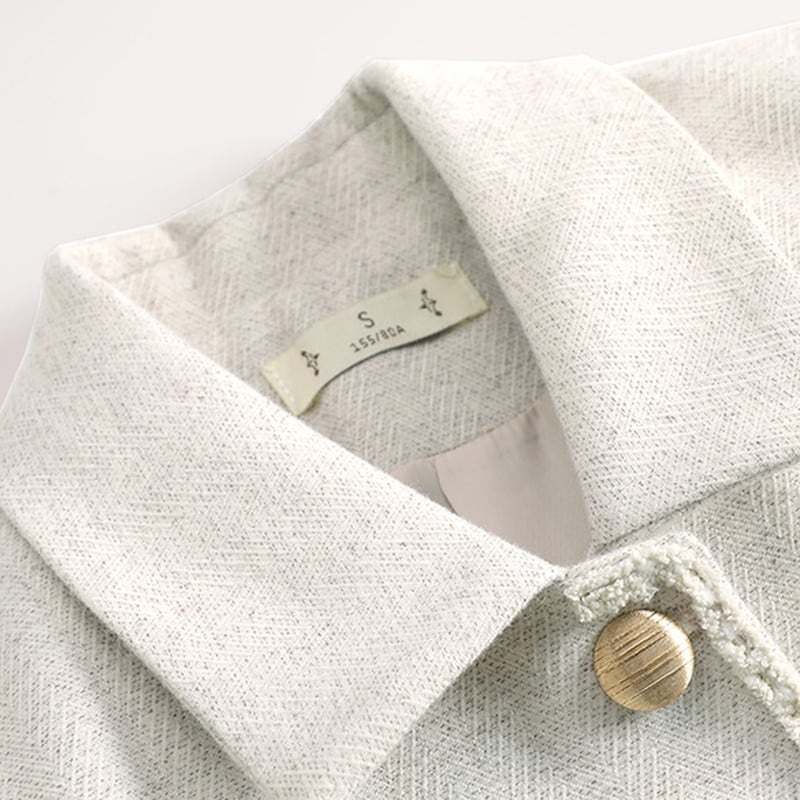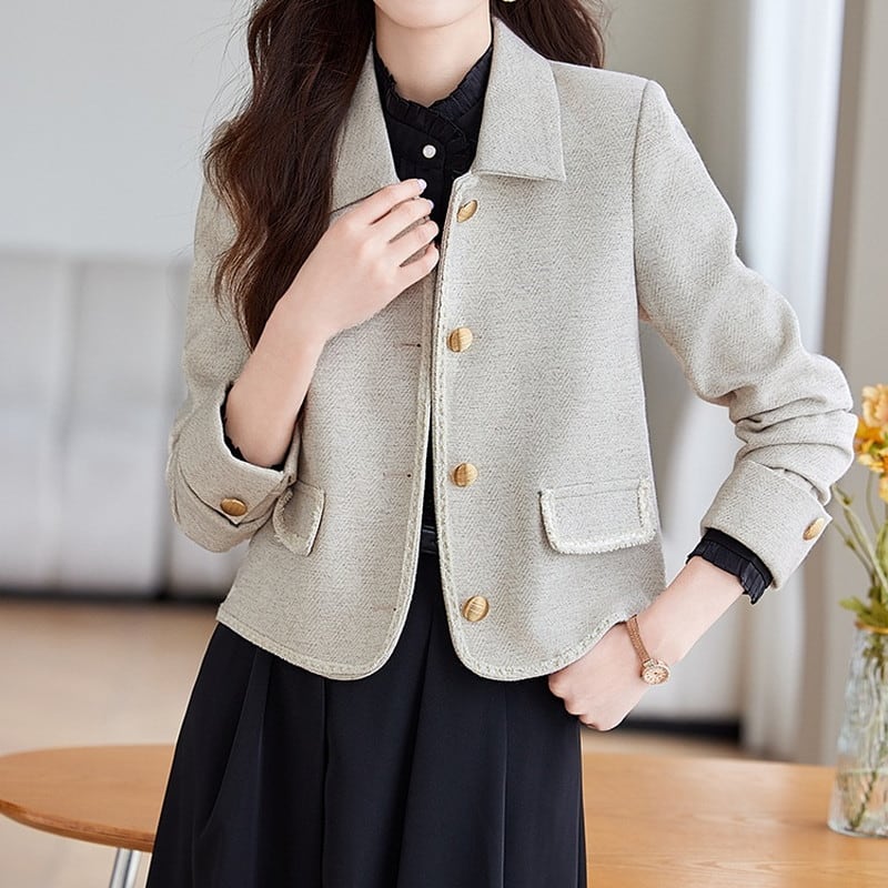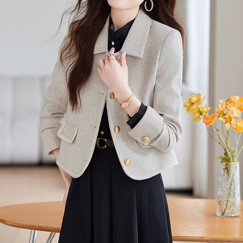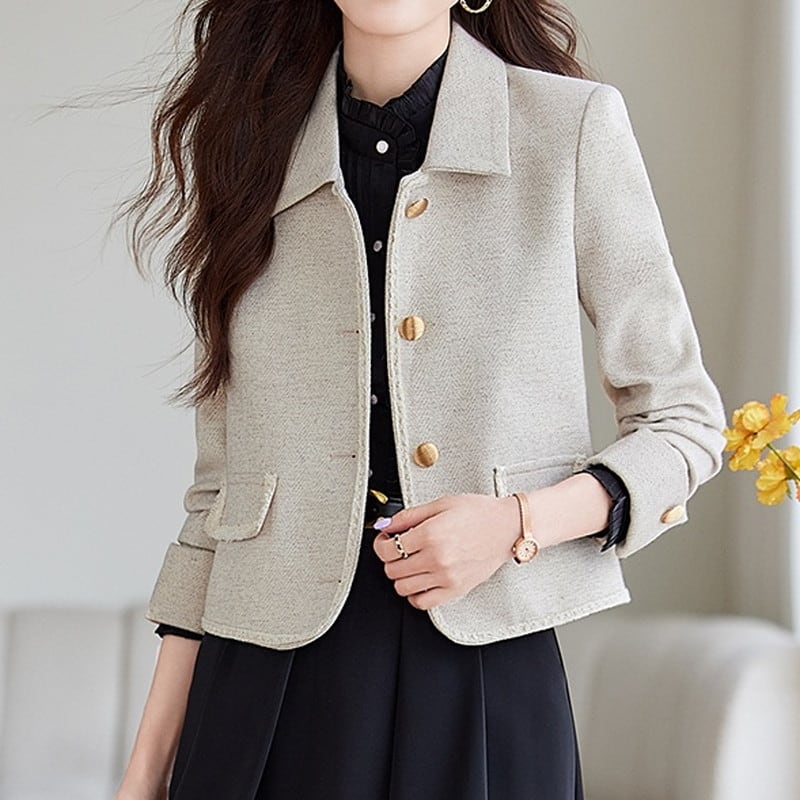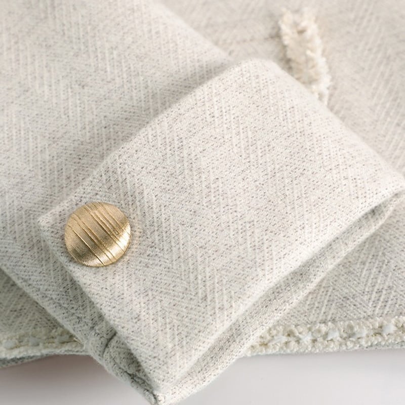 ゴールドボタンが上品なアクセントになりオフィスシーンにも、休日のお出かけにも活躍します。