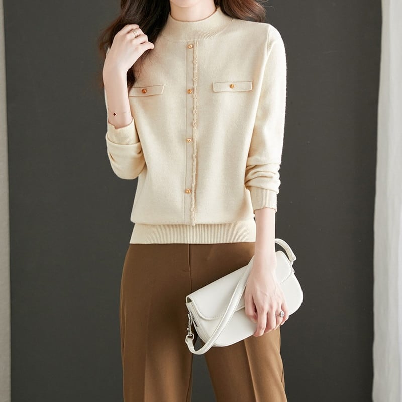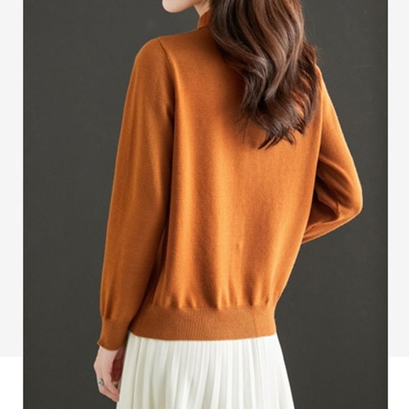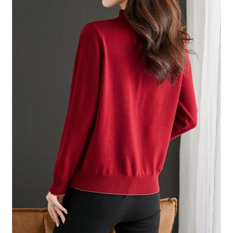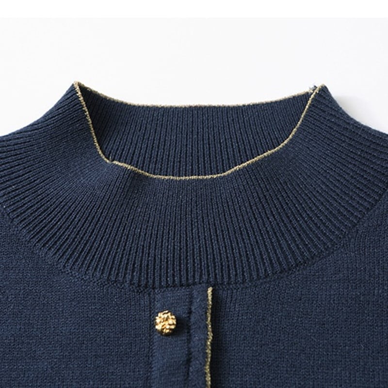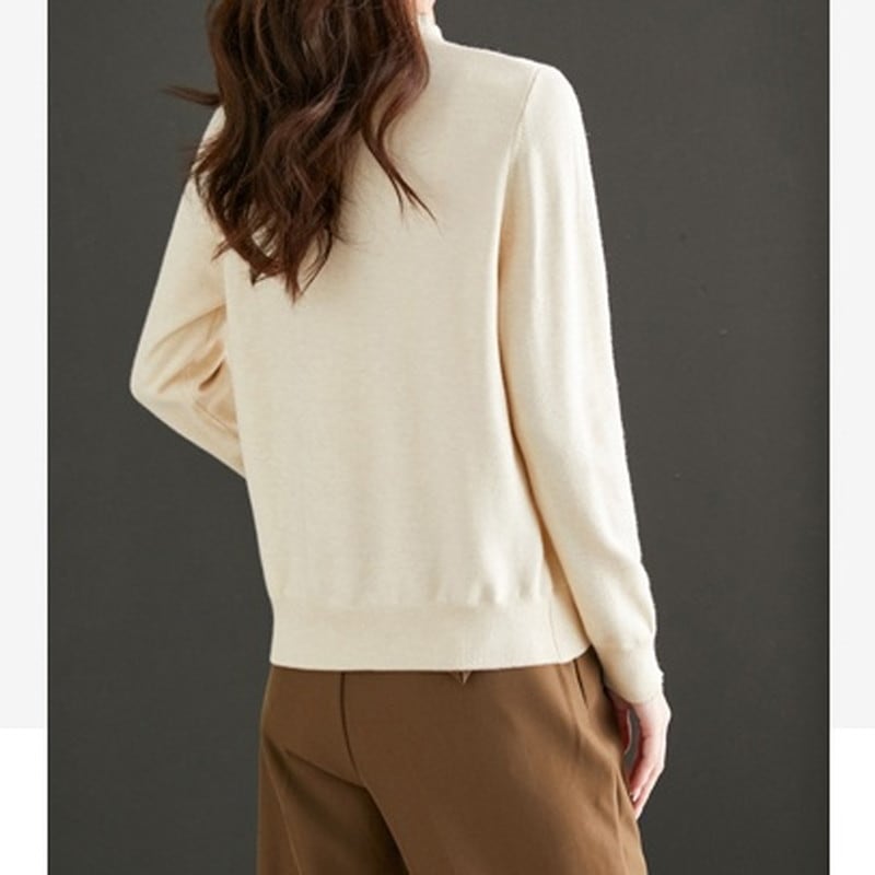 ボトルネックのすっきりとしたシルエットと、装飾ボタンが上品な印象のニットトップスです。