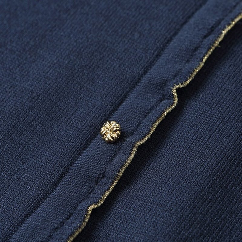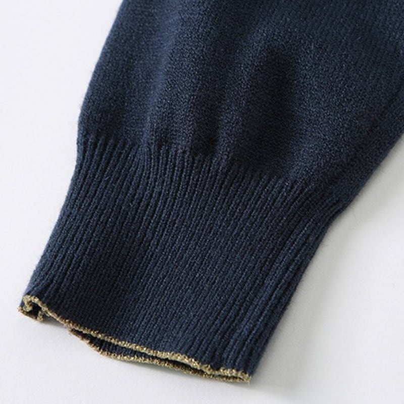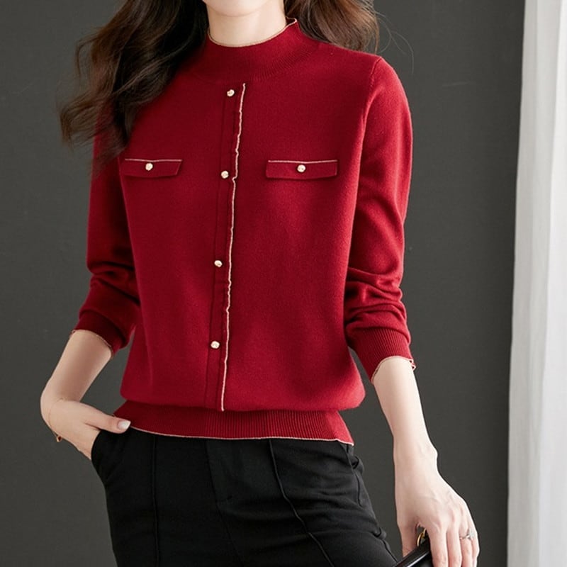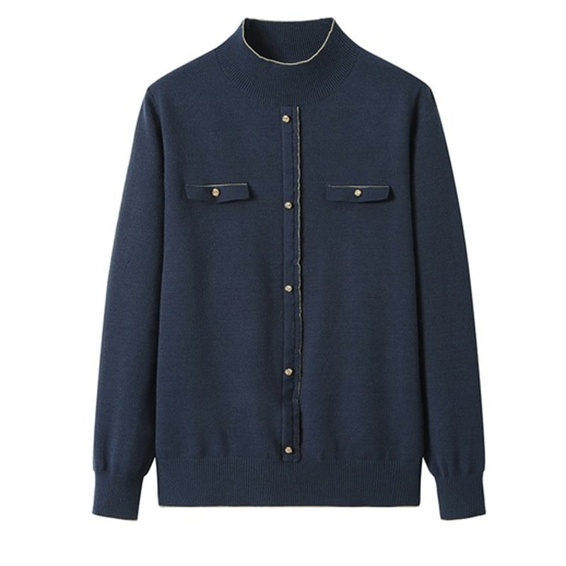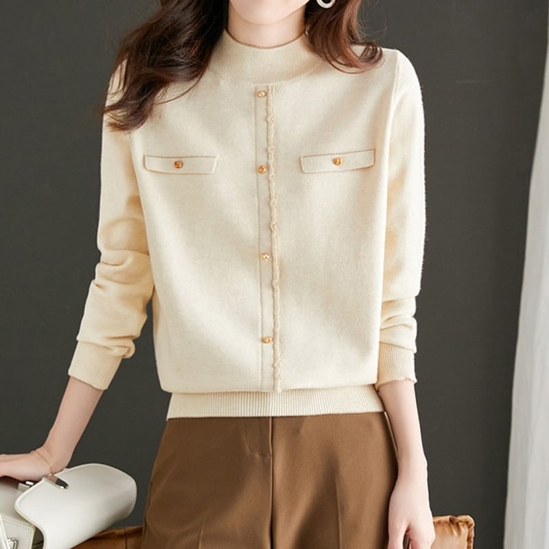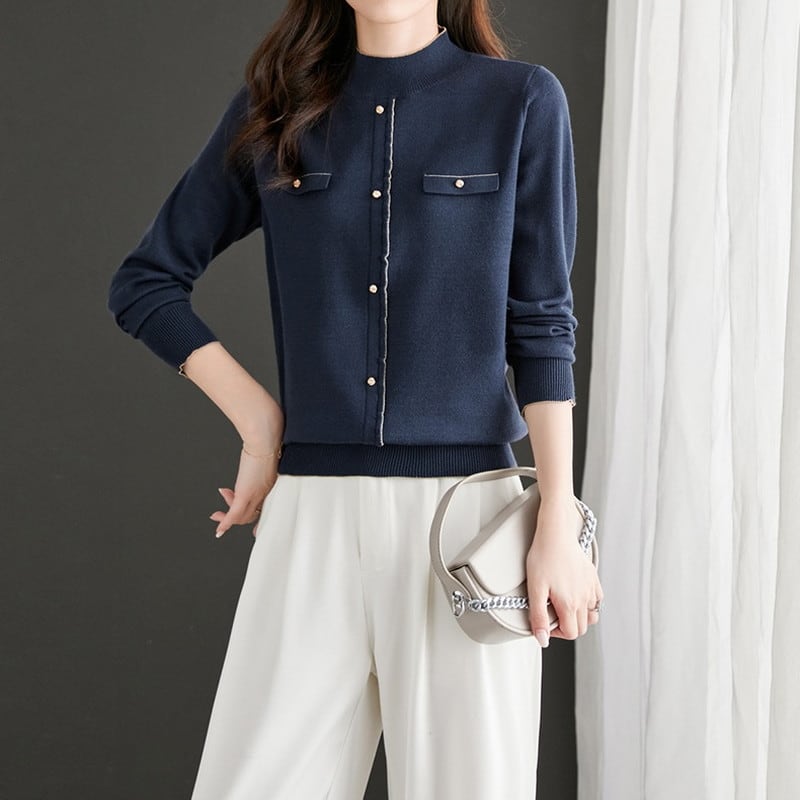 ボトルネックのすっきりとしたシルエットと、装飾ボタンが上品な印象のニットトップスです。