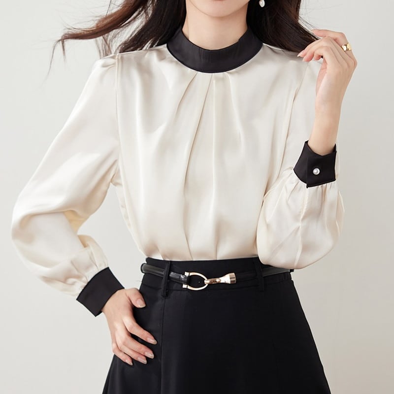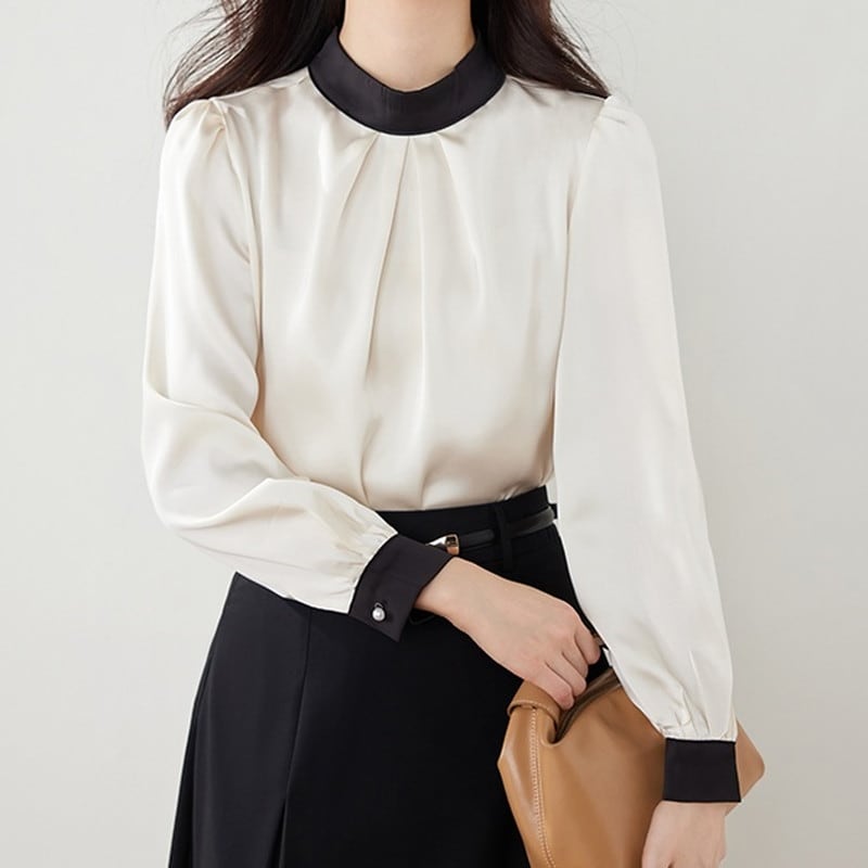 バンドカラーが首元をすっきりと見せ、上品で洗練された雰囲気を演出するブラウスです。