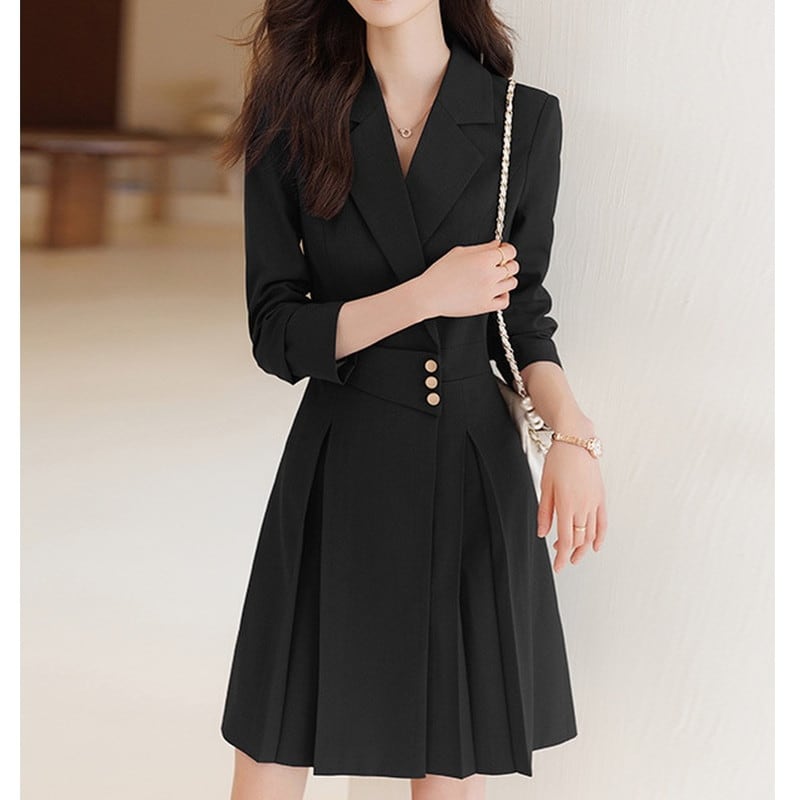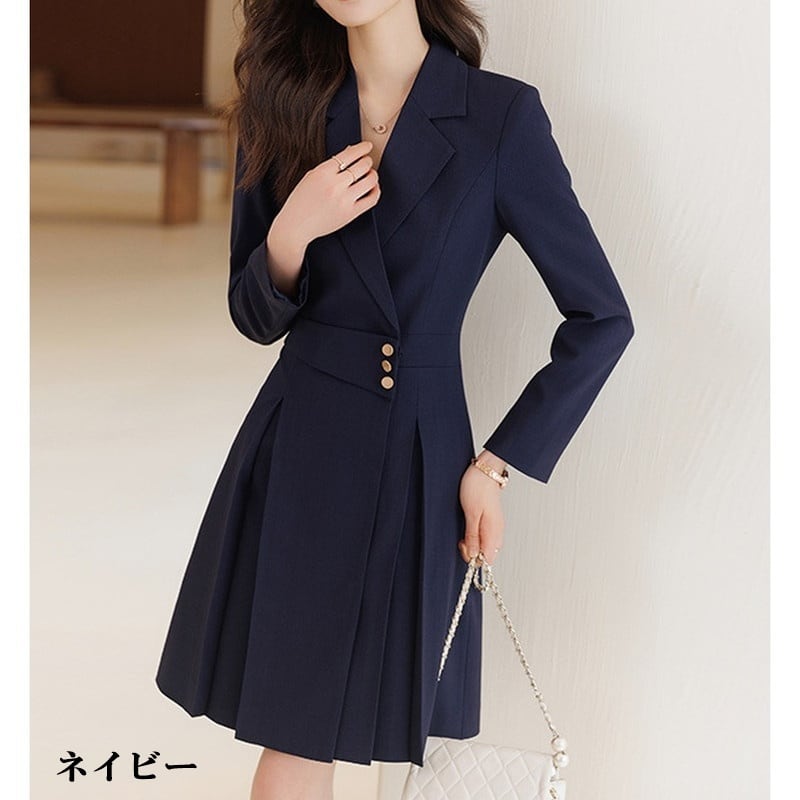 テーラードジャケットのような上品な襟元と、ウエストラインを引き締める切り替えデザインが大人の女性らしさを引き立てるワンピースです。