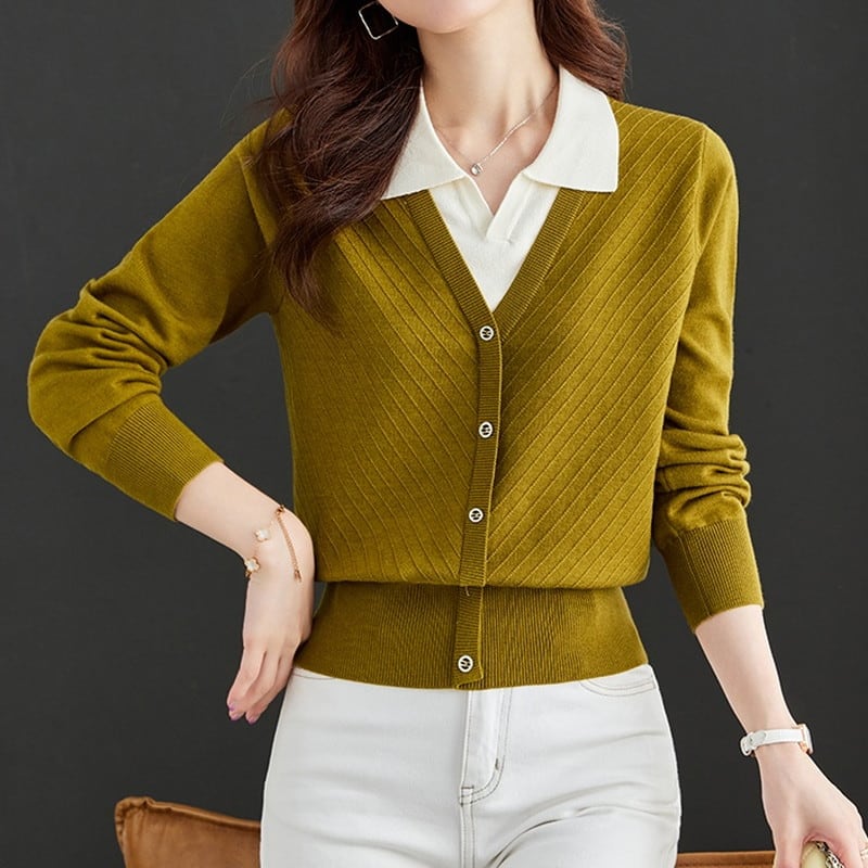 襟付きデザインが上品な印象をプラスし、オフィスからカジュアルまで幅広く活躍します。