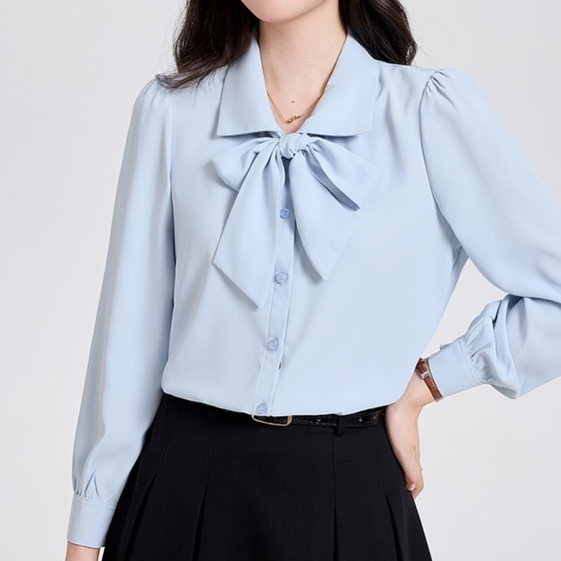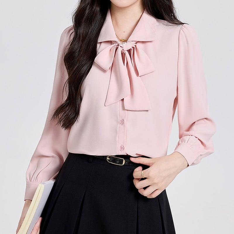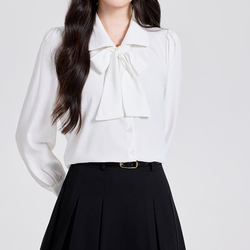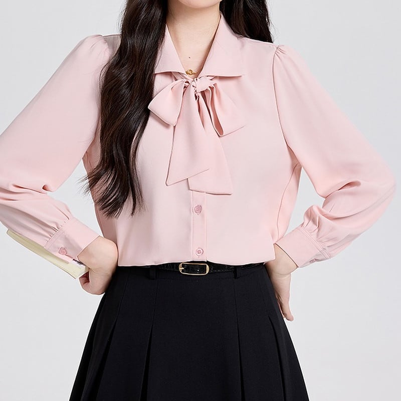 大きめのリボンタイが華やかな印象を与えるブラウスです。