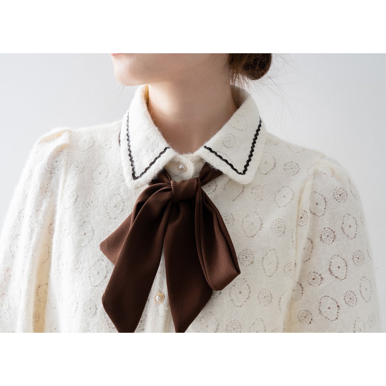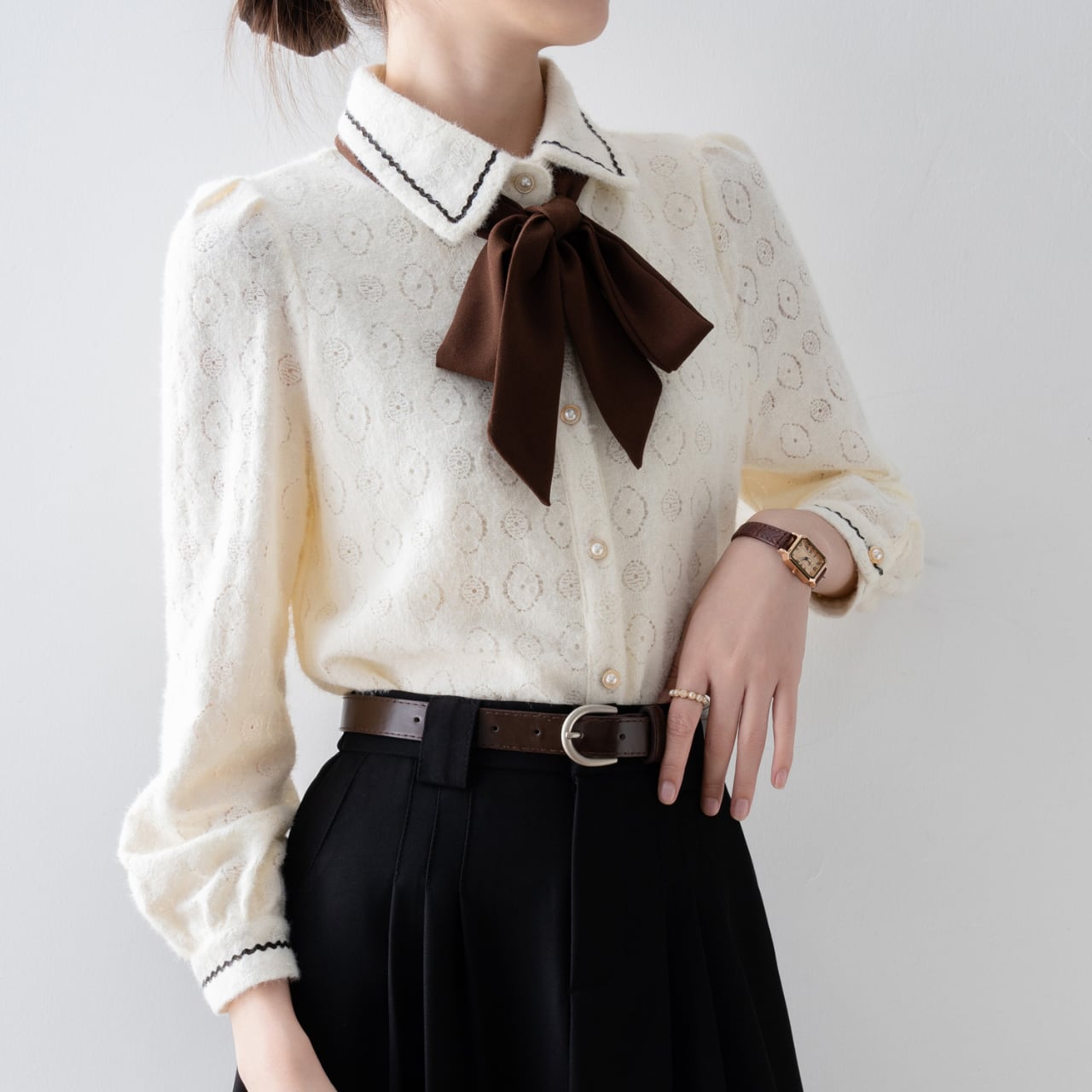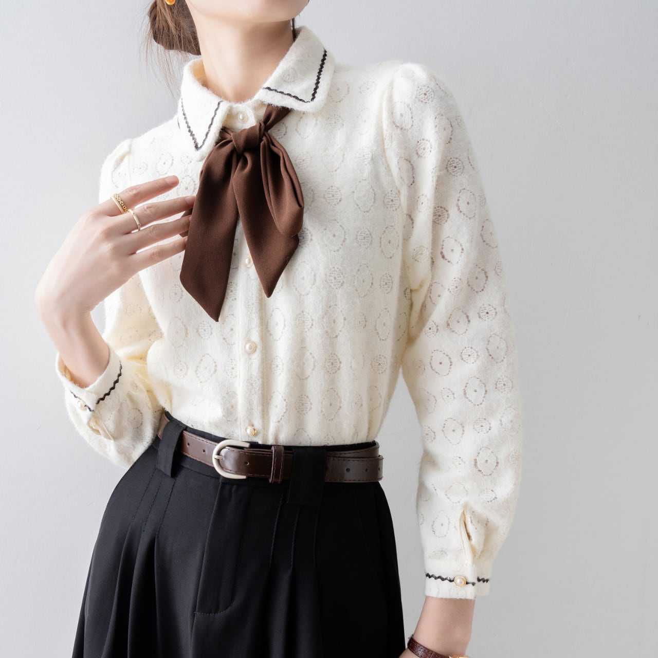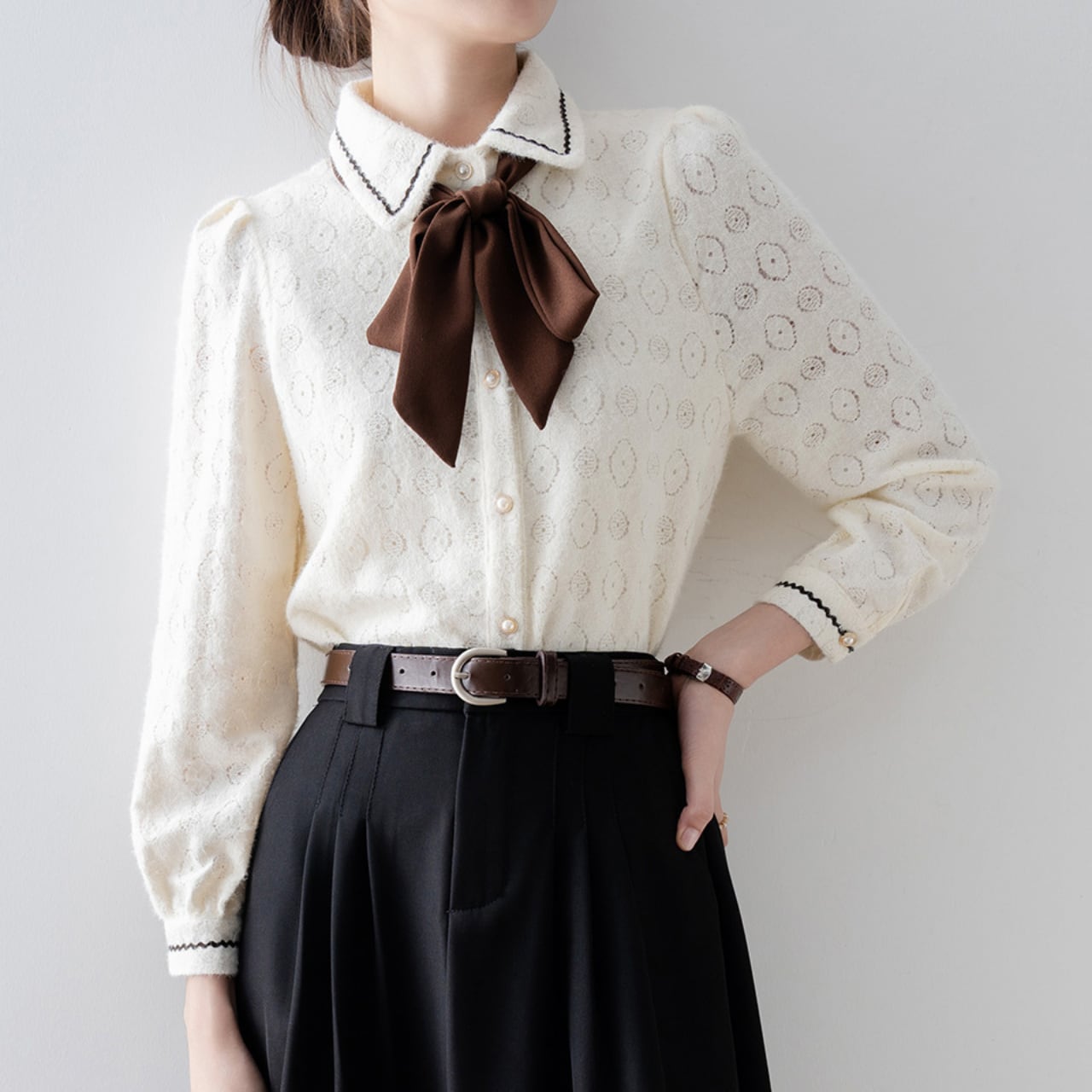 リボンタイが上品さを演出し、オフィスシーンからちょっとしたお出かけまで、様々なシーンで活躍します。