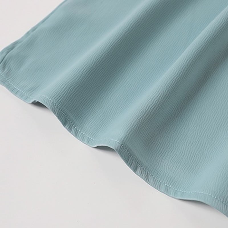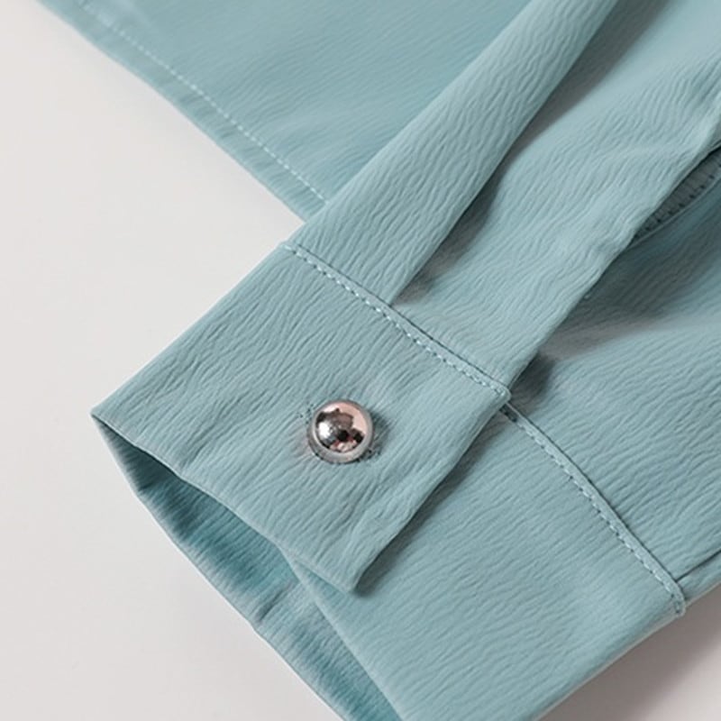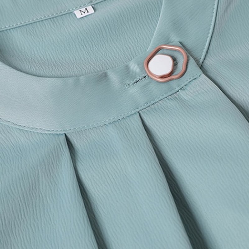 首元のワンポイントボタンが程よいアクセントとなり、シンプルながらも洗練されたスタイルを演出します。