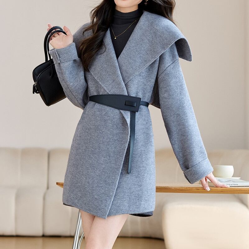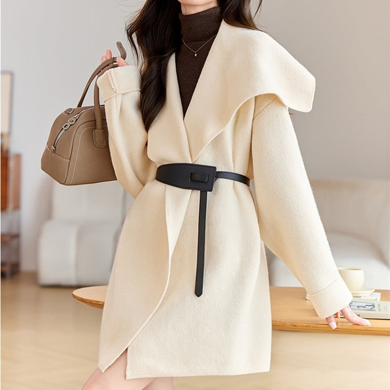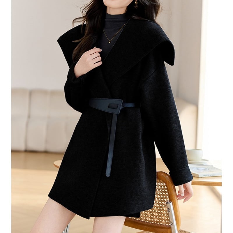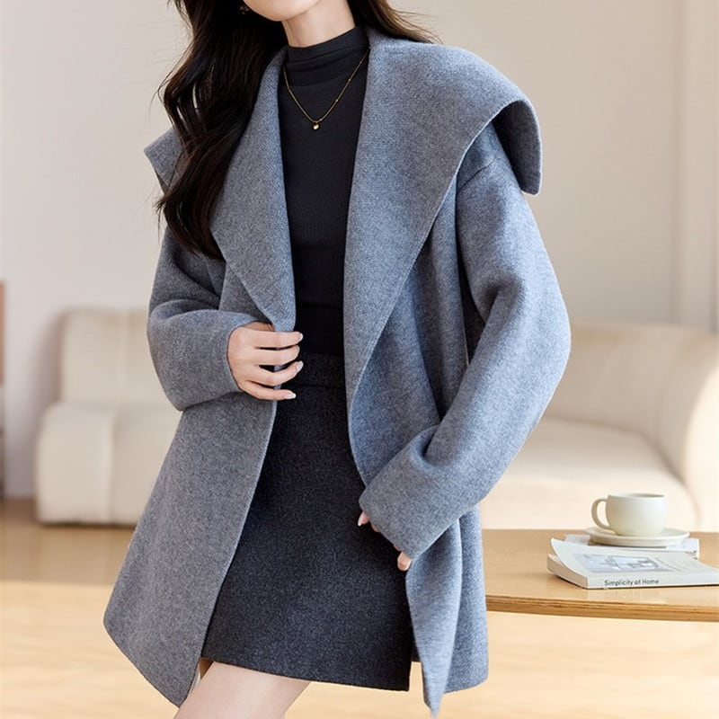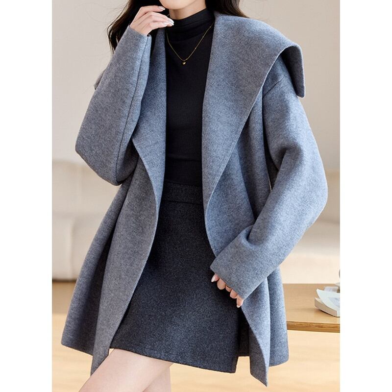 立体感のある大きめの襟が顔まわりを華やかに演出するコートです。