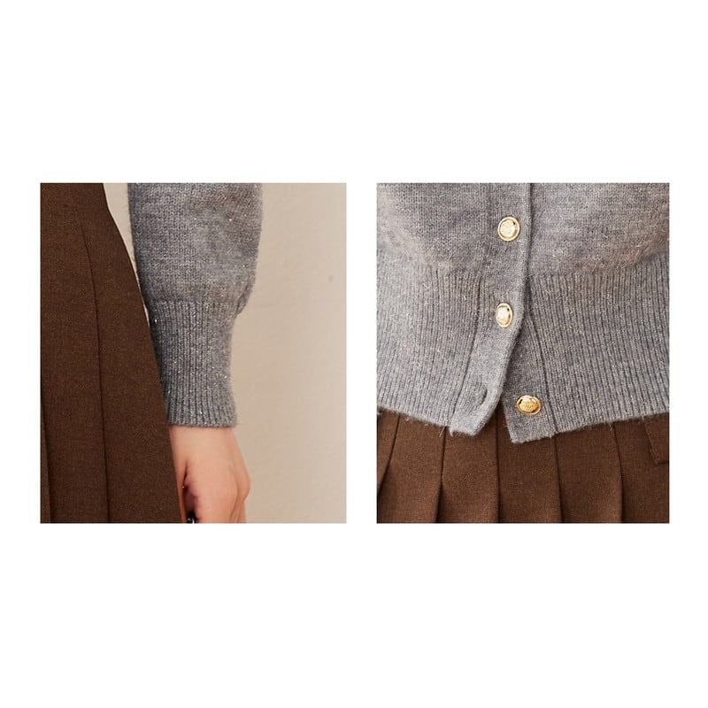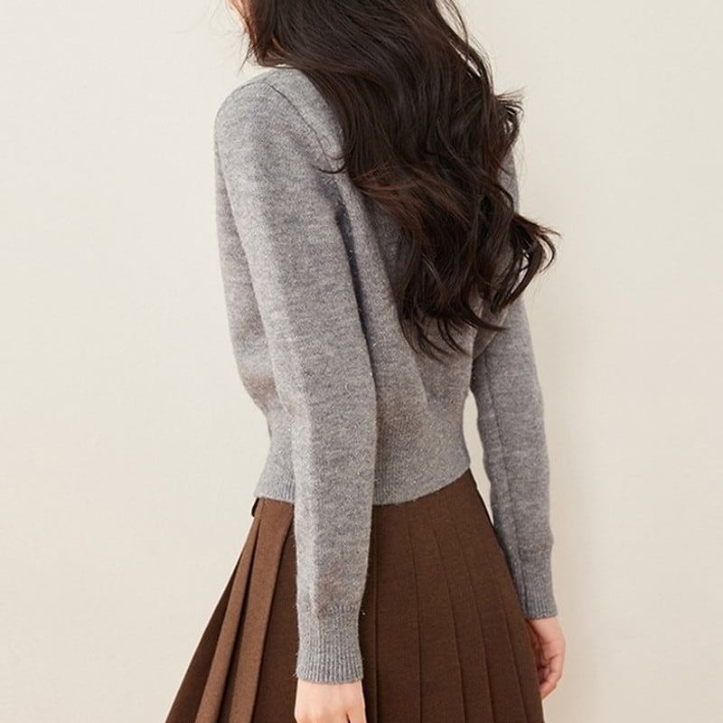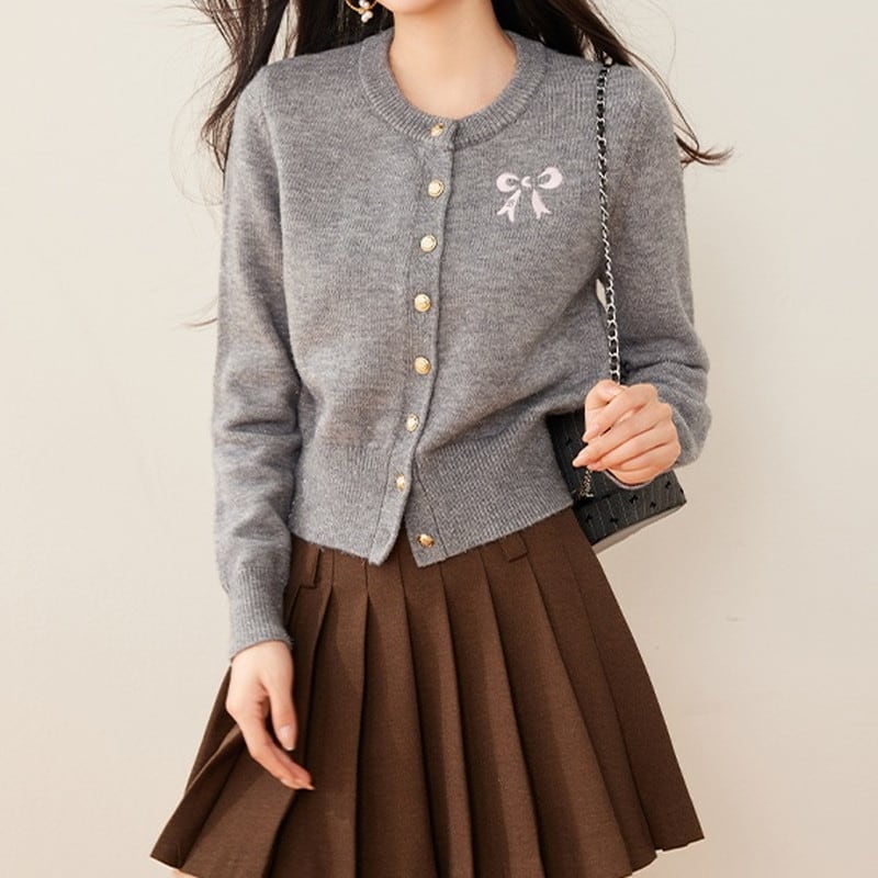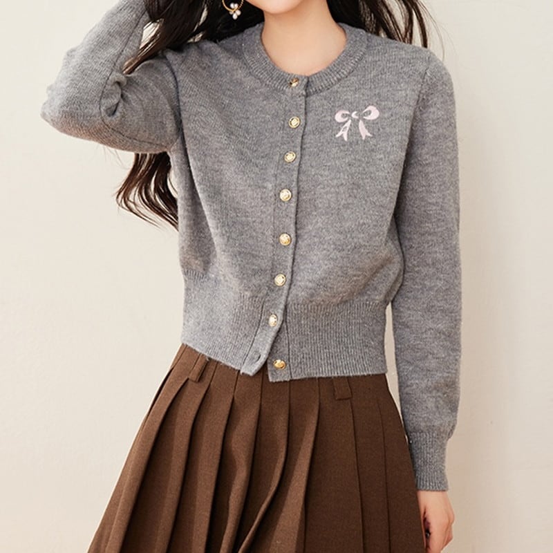 胸元のリボン刺繍がさりげなく可愛らしさを添えるクルーネックカーディガンです。