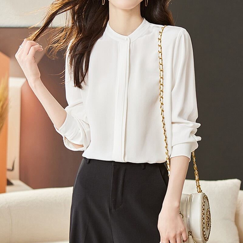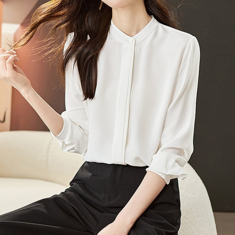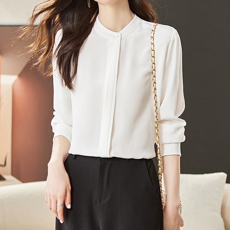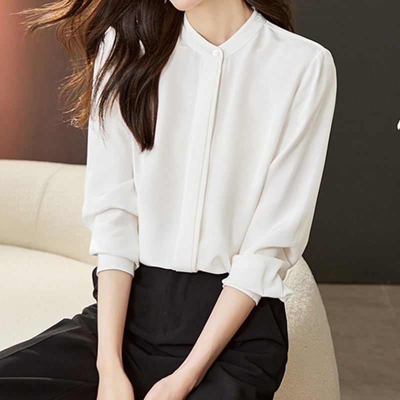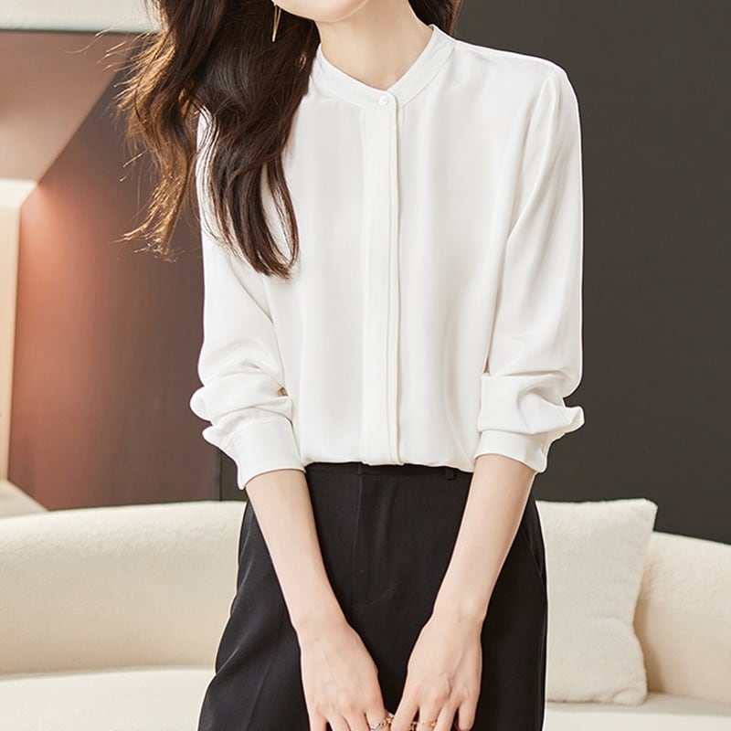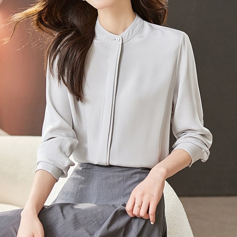 上品で洗練された印象を与えるバンドカラーブラウスです。