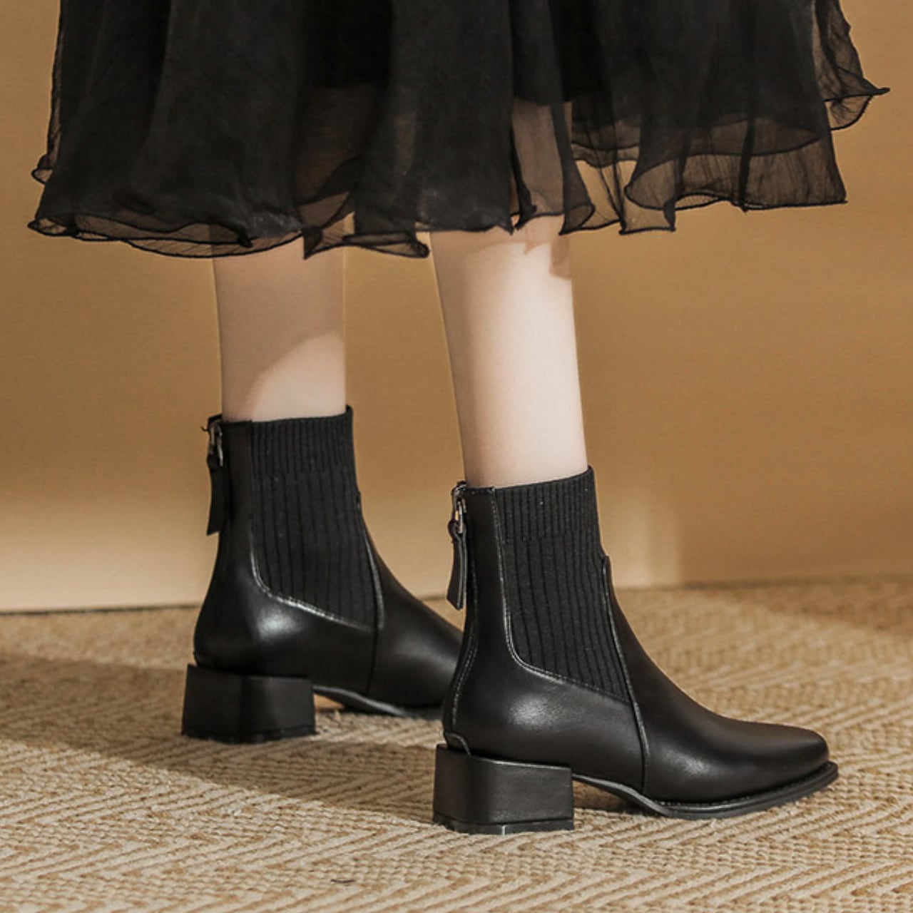 異素材の組み合わせが目を引くショートブーツです。